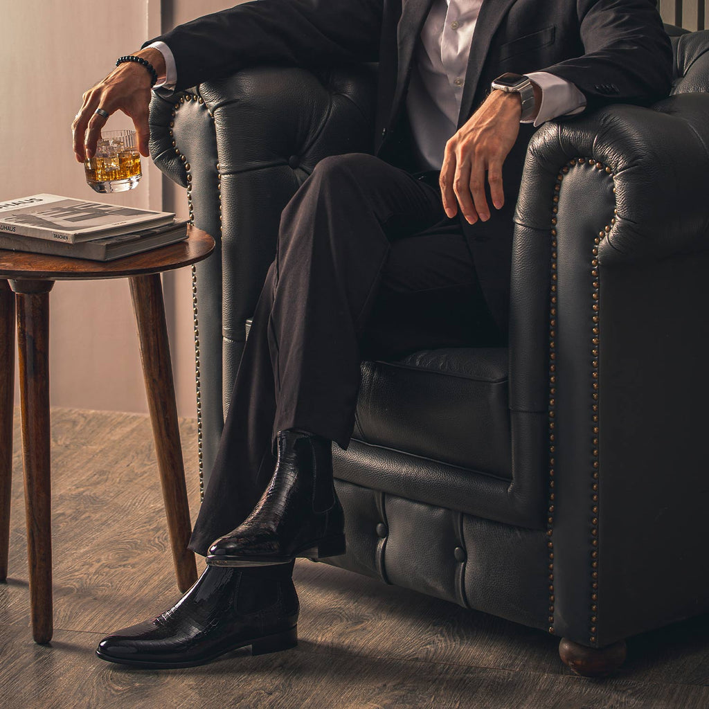 A pair of handcrafted black croco patent shiny leather chelsea boot, has a slip on closure. Featuring leather pull tab and elasticated side panels to ensure comfortably slip them on and off. Its complete with leather lining and padded leather insole. The slip on boot sit on a hand finished leather sole, nailing on top lift.