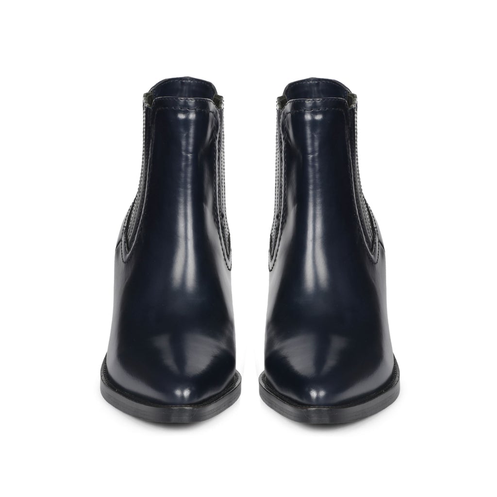 A pair of handcrafted blue patent leather pointed toe boot, Featuring leather covered elasticated side panels to ensure comfortably slip them on and off. Its complete with leather lining and padded leather footbed. The slip on boot sit on a stacked heel.