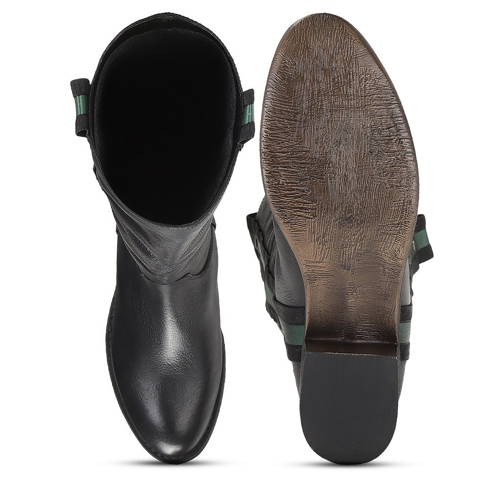 A Pair of round toe leather long boot has regular styling, both side multi nylon strip.slip on detail.