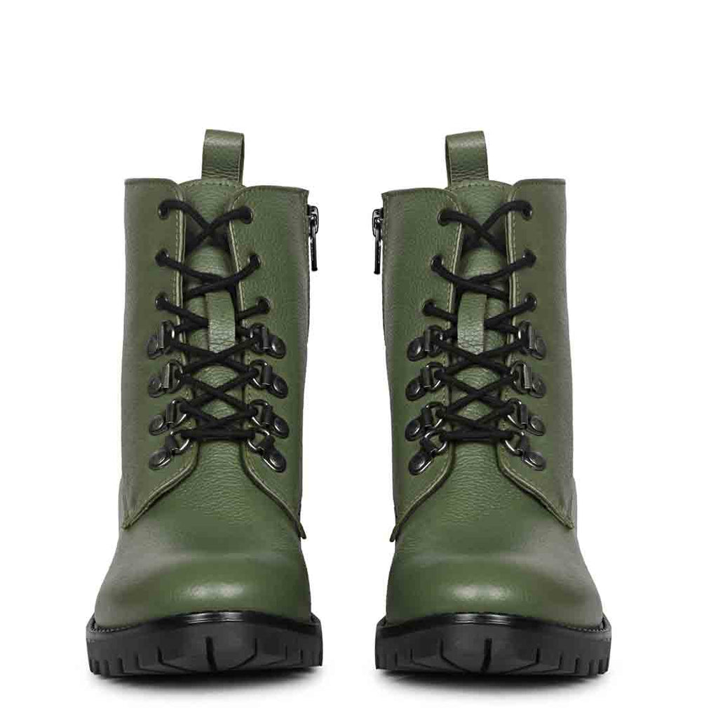 Sophistication and style go hand-in-hand when it comes to SaintG latest collection. These Saint Moira olive green biker boots are crafted from Genuine leather upper, soft leather lining and padded leather footbed. Featuring lace-up front with metal eyelet, comes with a slip-resistant handmade eva sole which ensures that you do not slip or fall on any surface. the rounded toe and leather pull up tab completes the design.