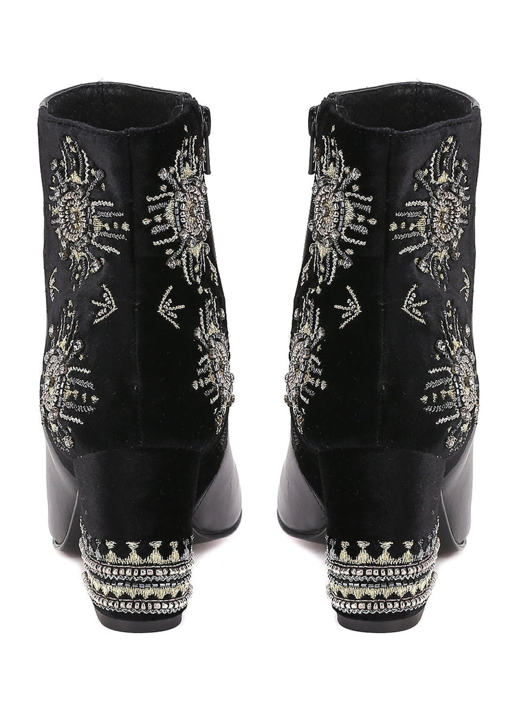 A pair of black pointed toe heeled boot, has mid-top styling, closed back with zip closure inside detail. back side decorative with embroidery .