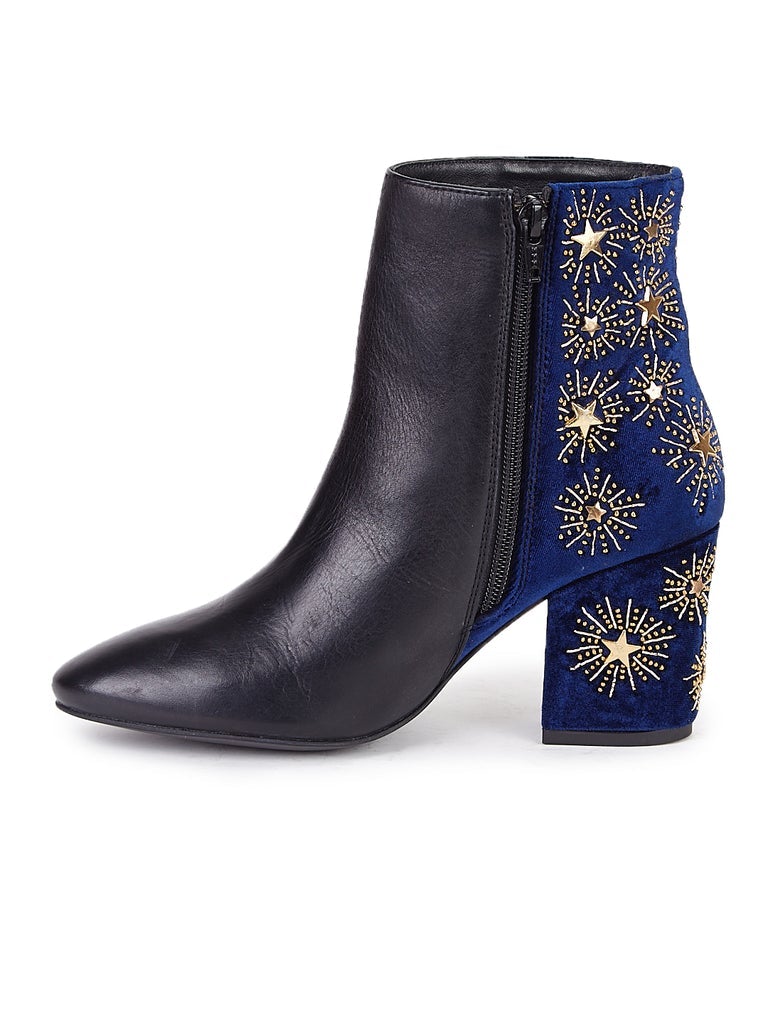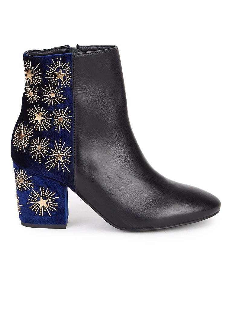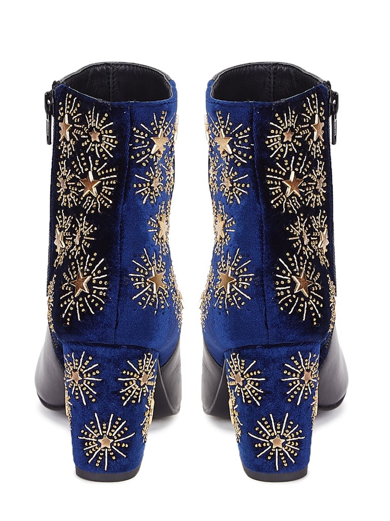 A pair of blue heel boot , has mid-top styling, closed inside zip . Back of the boat decorated with gold hand embroidery. On blue velvet upper and heel.