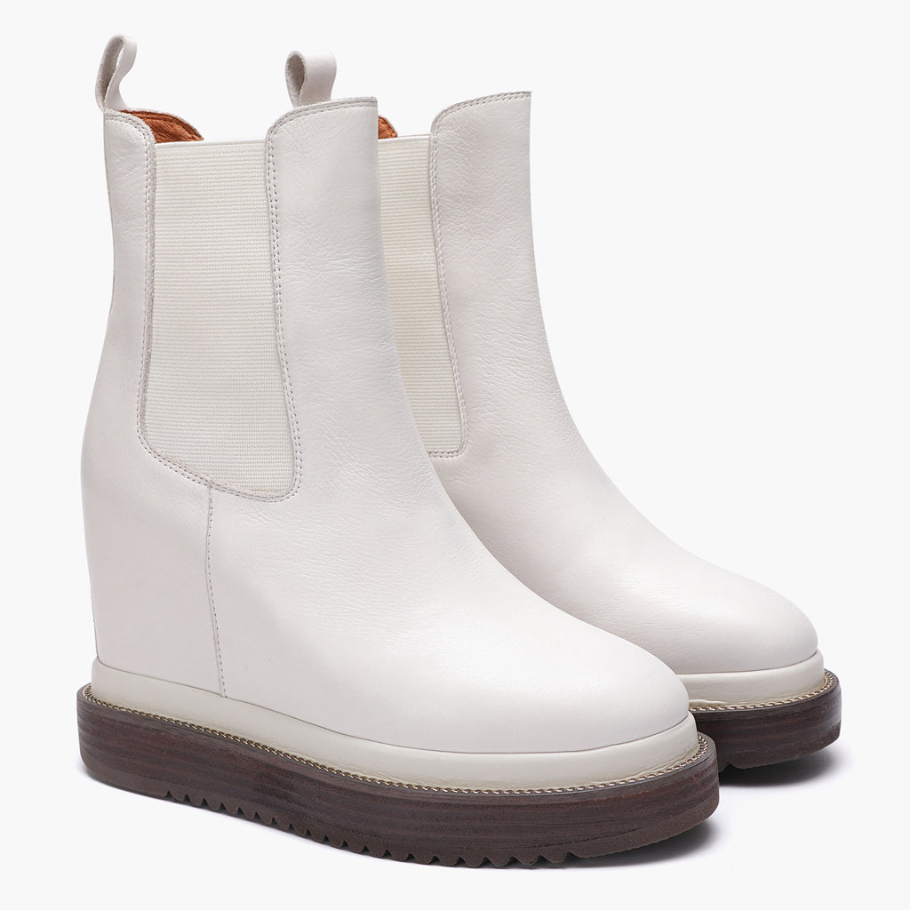 Slip into style with the Veronica off white leather inside wedge heel boots. Featuring both side elasticated panels and a pull tab, these leather boots provide a perfect fit. Stay cozy with their leather lining and insole, while rocking a handcrafted luxury look for winter.