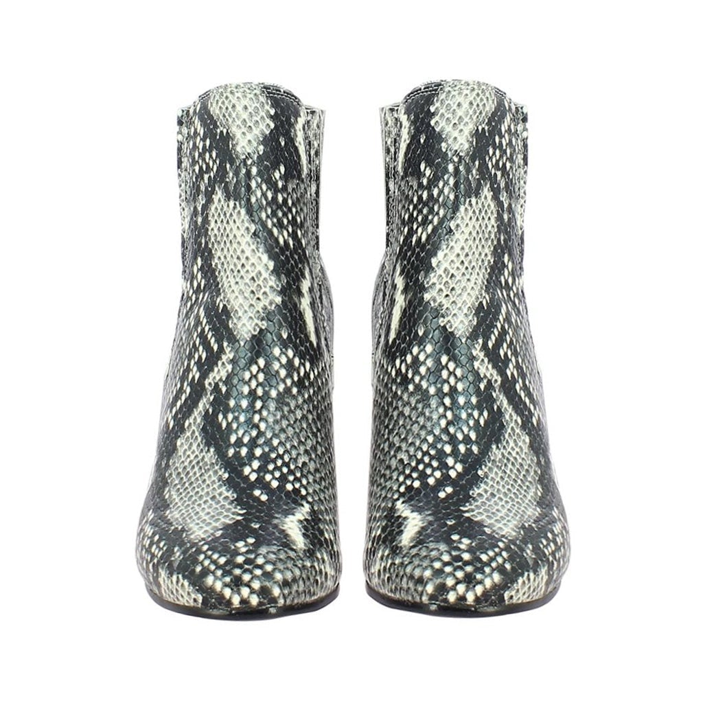 A pair of classic gery python print vegan leather chelsea boot, has a slip on closure. Featuring covered elasticated side panels to ensure comfortably slip them on and off. Its complete with fleece lining and padded leather insole. Finished with a covered block heel.