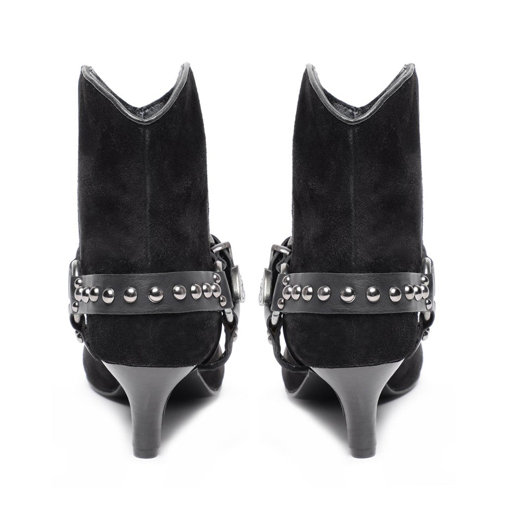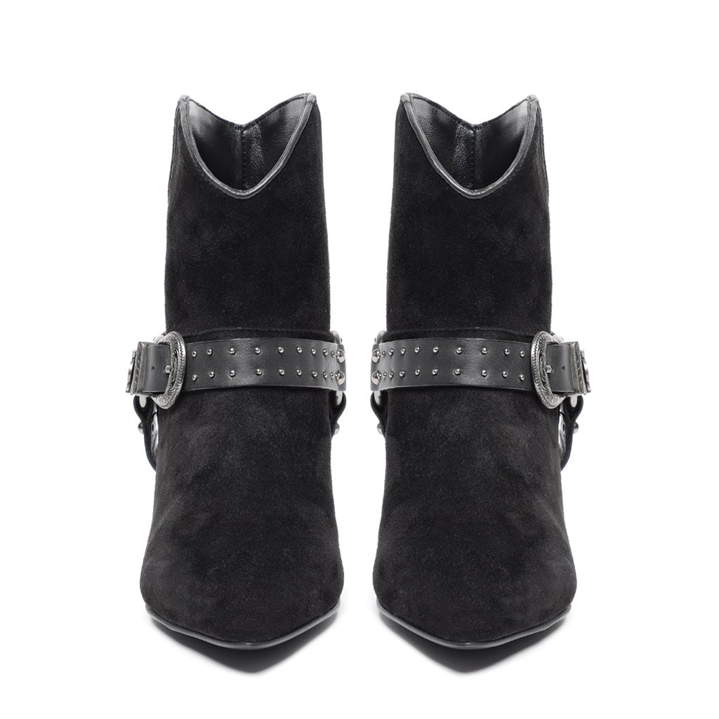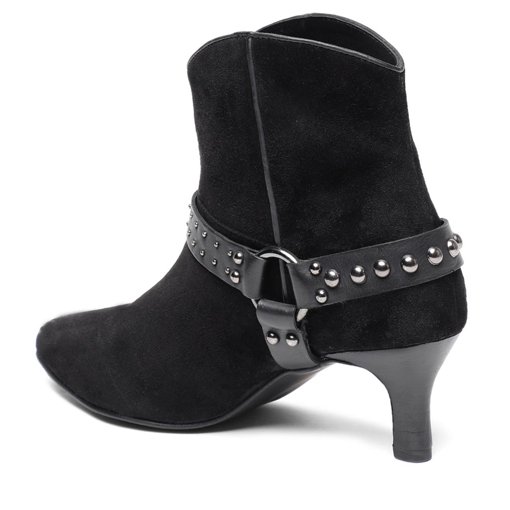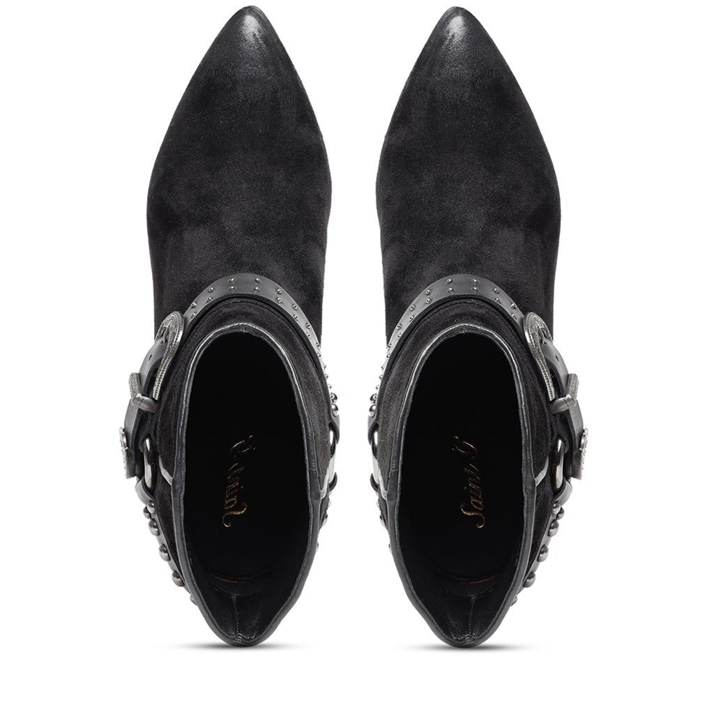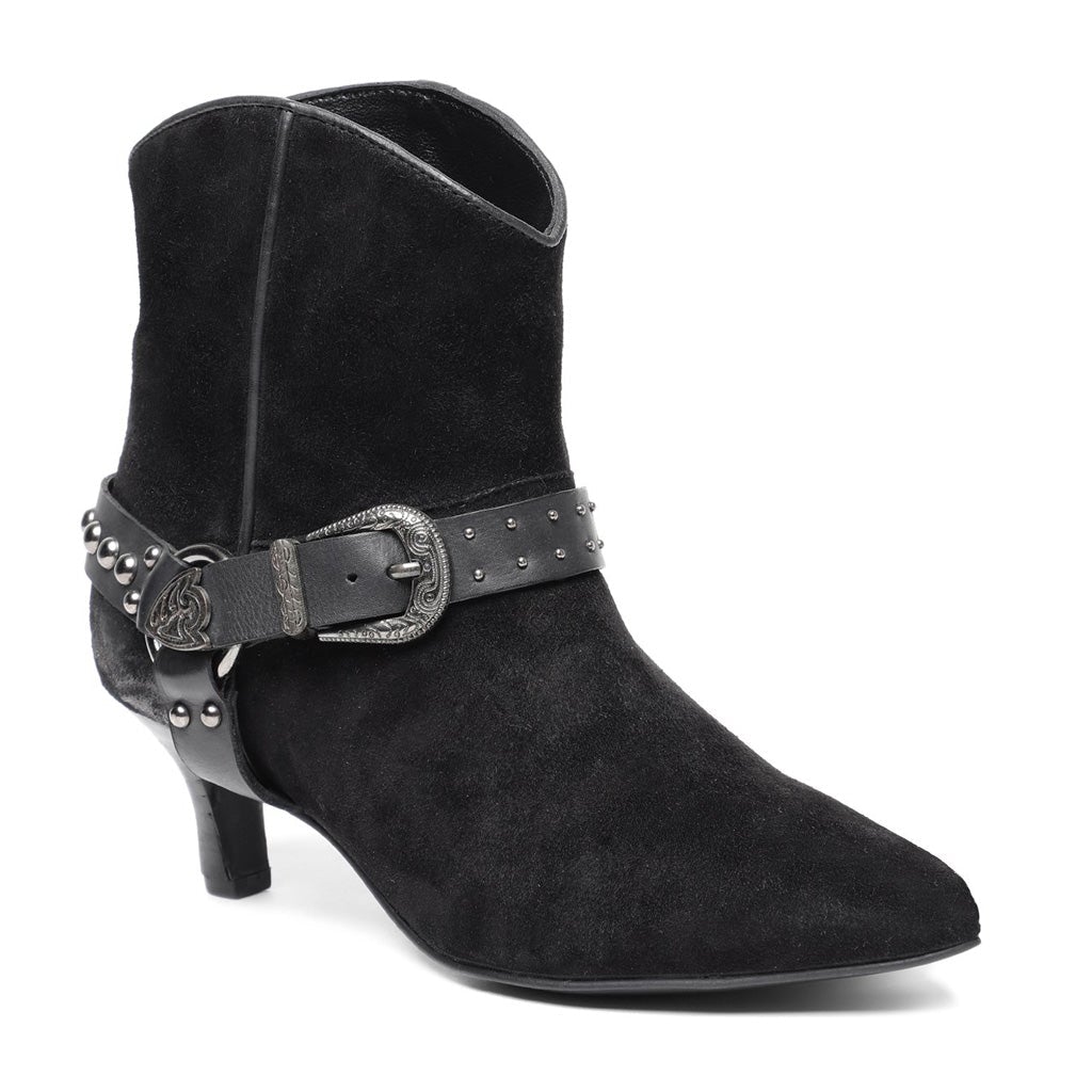 Saint kitten heel ankle boot in black suede, has a pointed toe. Padded leather footbed with stamped logo. 2.3 inches heel.