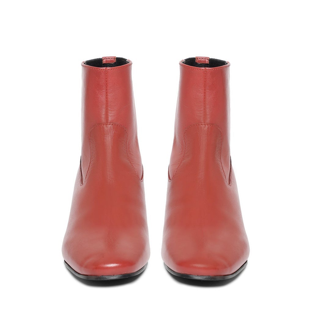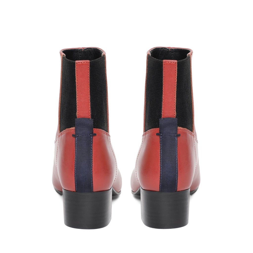 Make a statement with the striking ankle boots finished with red leather from SAINT G. Resting on a sturdy block heel and finished with a pointed toe. It's a bold and stylish choice and has an easy slip on design with zipper.