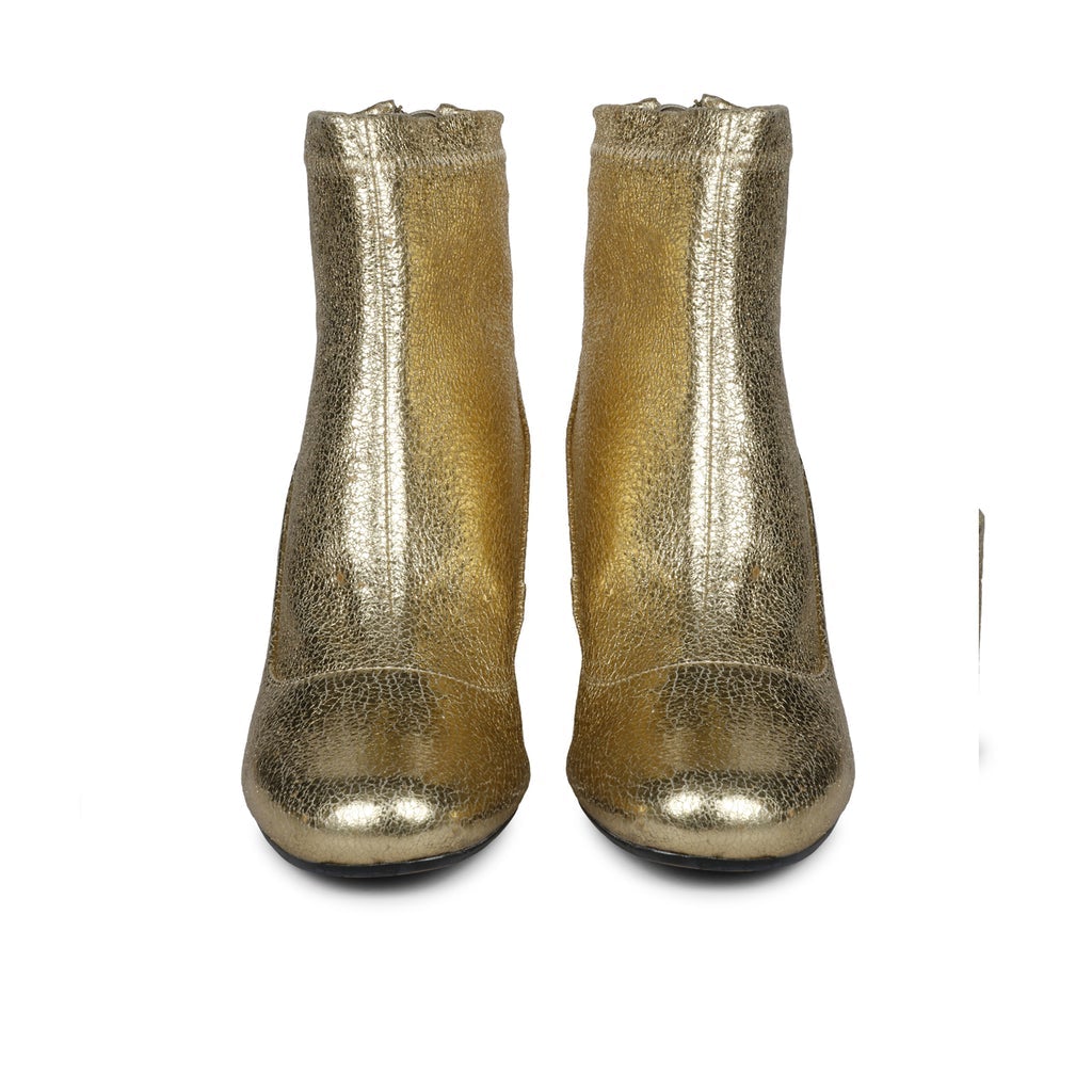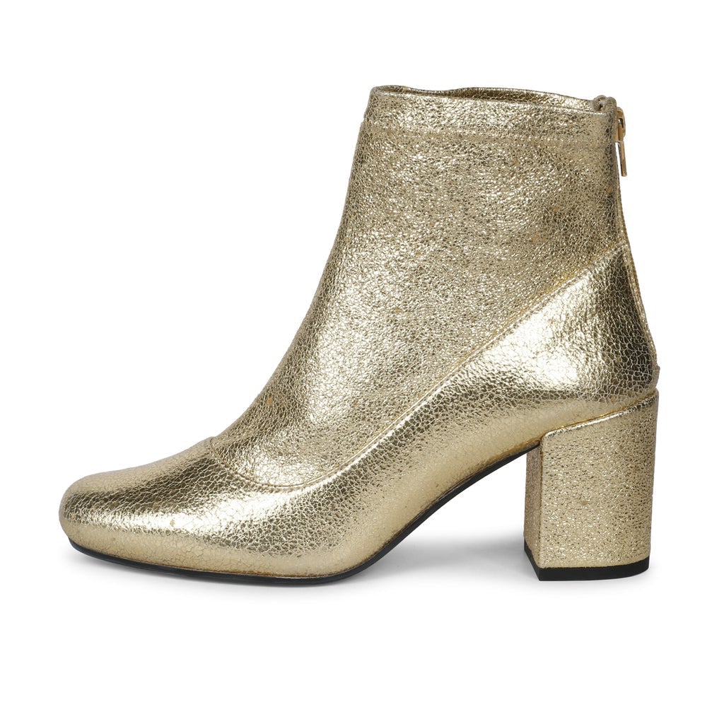 A pair of gold  toe heeled boots, has high-top styling, open back zip detail