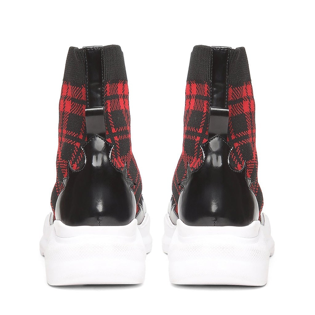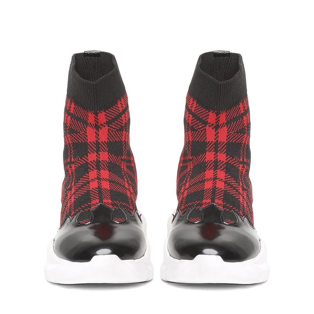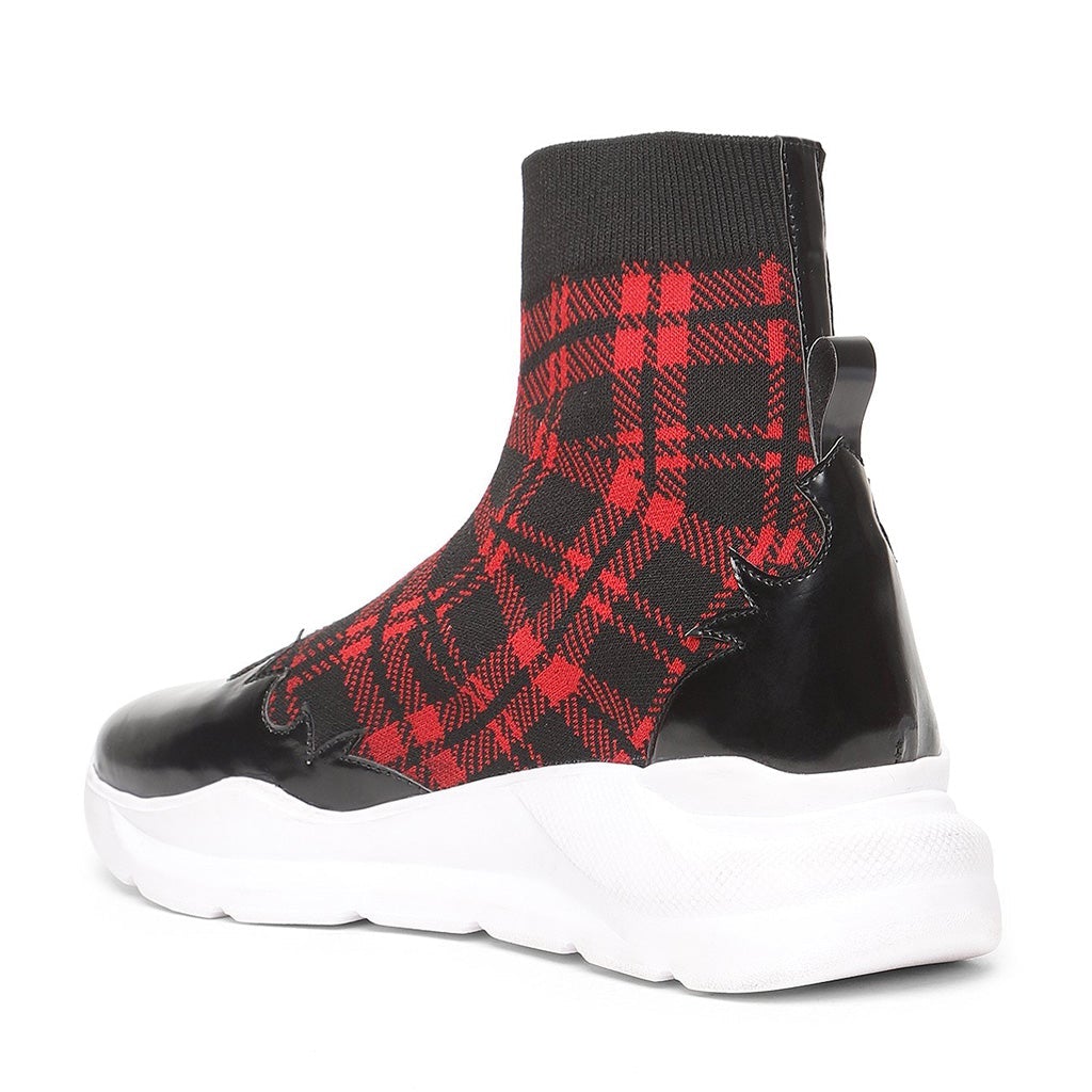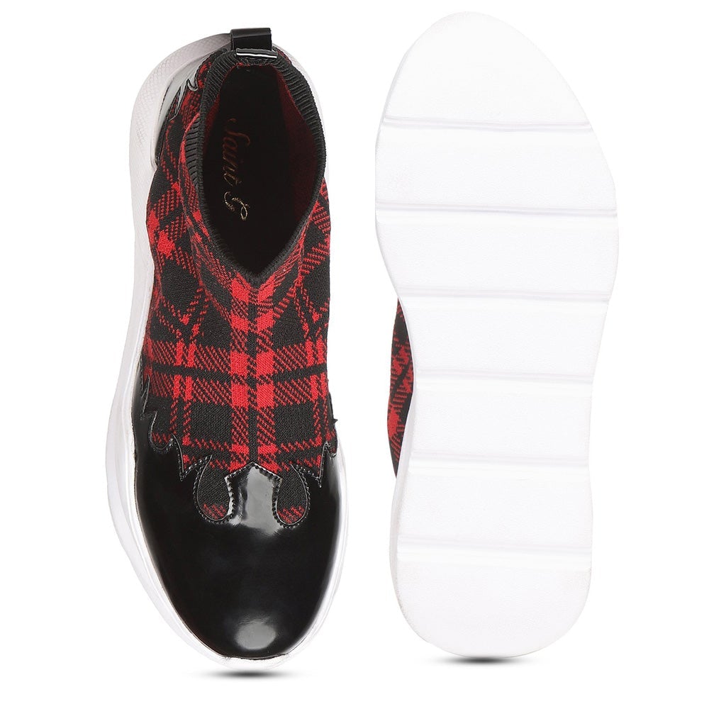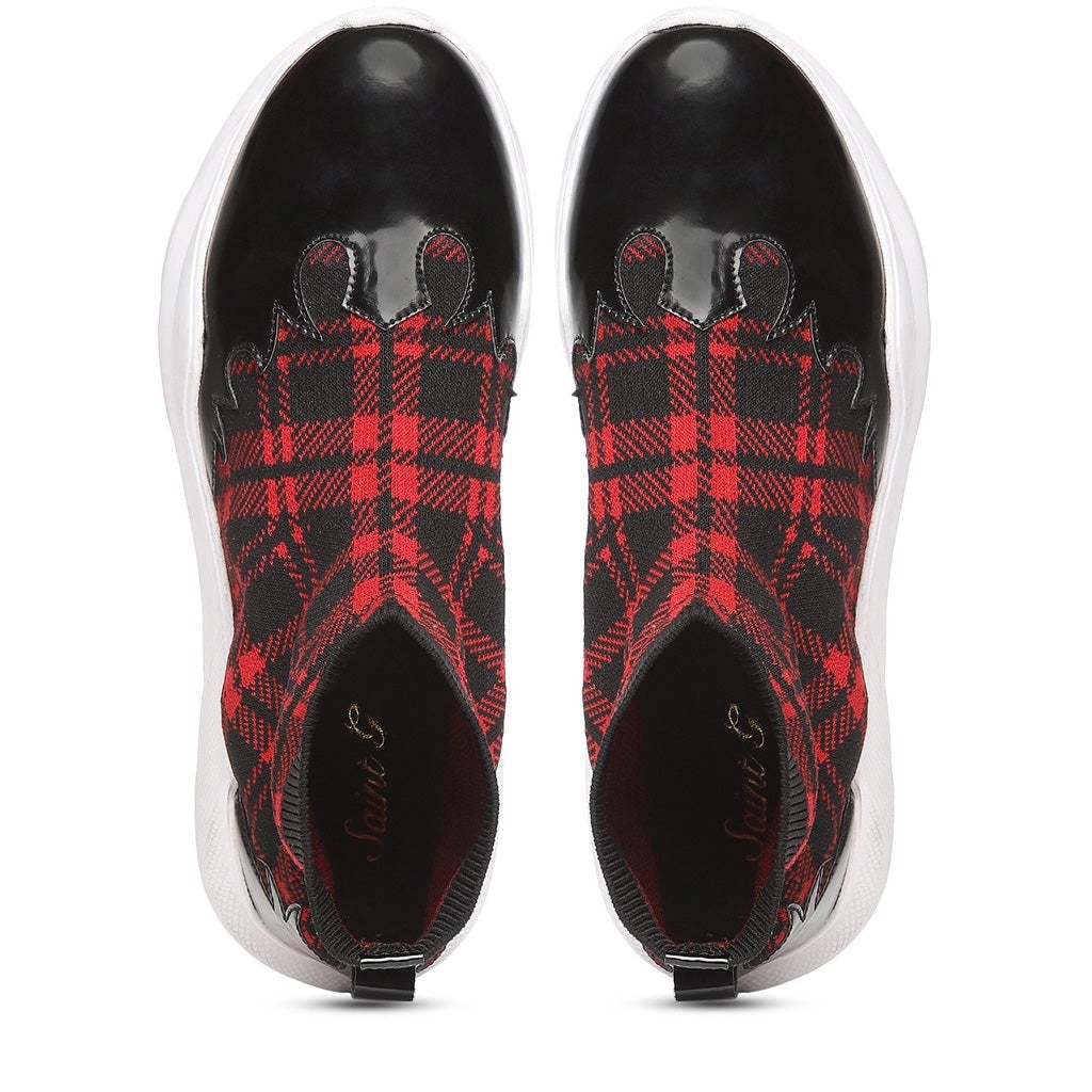 Saint Gratia red slip on red fabric with black patent leather boots handcrafted by SaintG's legendary bootmakers, featuring round toe, front lace-up fastening, walking heel and crepe sole to provide traction and stability.
