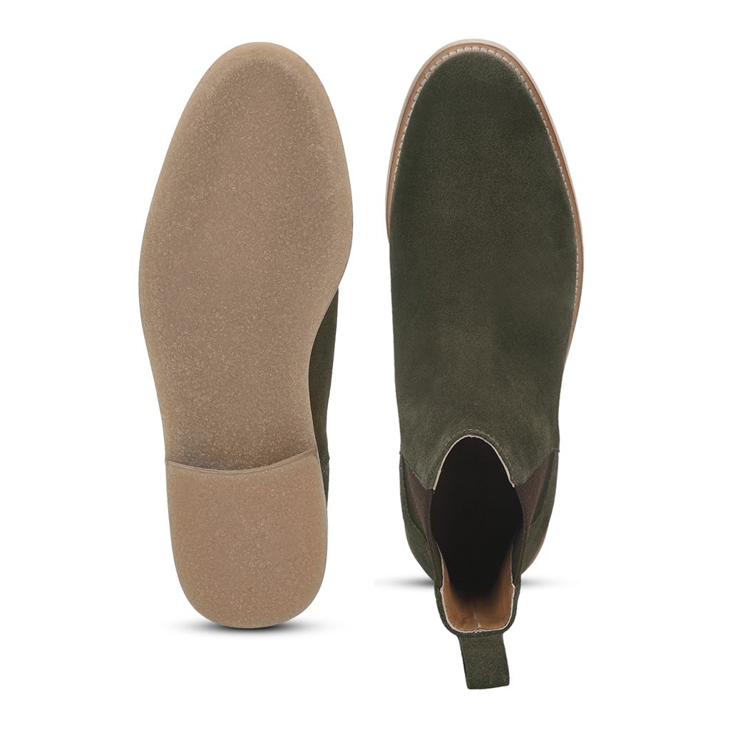 A pair of handcrafted olive suede leather chelsea boot, has a slip on closure. Featuring leather pull tab and elasticated side panels to ensure comfortably slip them on and off. Its complete with leather lining and padded leather footbed. The slip on boot sit on a crepe sole.