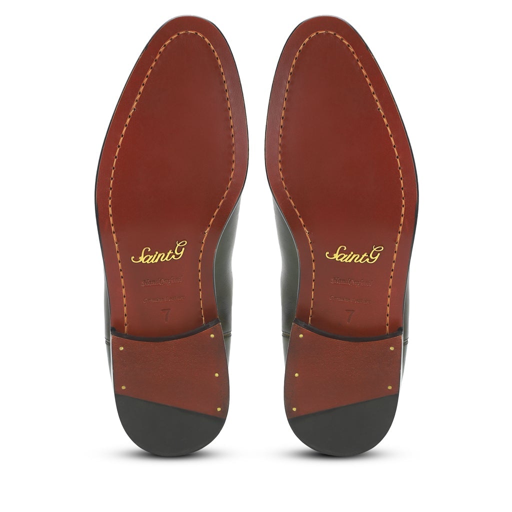 THE ROYAL SAINT G METAL LOGO BRANDING DONE ON THE HAND CUOIO FINISHED LEATHER SOLE WITH STITCH.