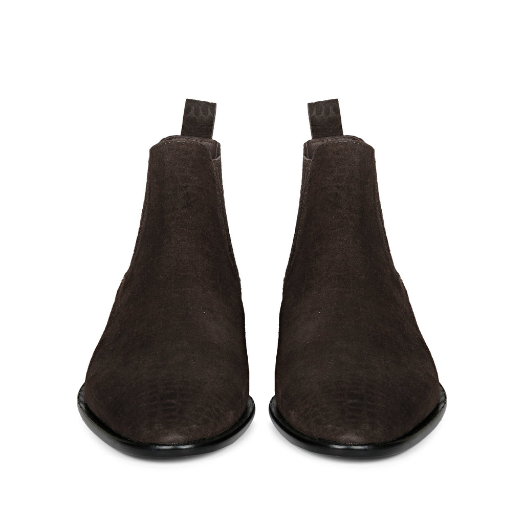 A pair of handcrafted brown croco print suede leather chelsea boot, has a slip on closure. Featuring leather pull tab and elasticated side panels to ensure comfortably slip them on and off. Its complete with leather lining and padded leather footbed. The slip on boot sit on a italian sole.