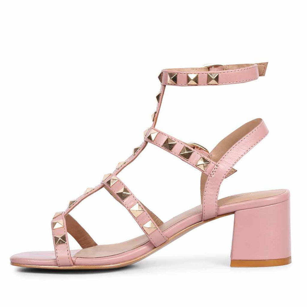 Add these Angela metal studded pink leather handcrafted heels from SaintG to your new season closet. This cage design highly recommended heels are crafted from a premium leather with luxurious leather lining and tunit sole. Easy to wear slip on style featuring double buckle fastening to the ankle, gold metal studded embellishment adds detail to the strapping. Has a leather covered block heel with tunit sole.