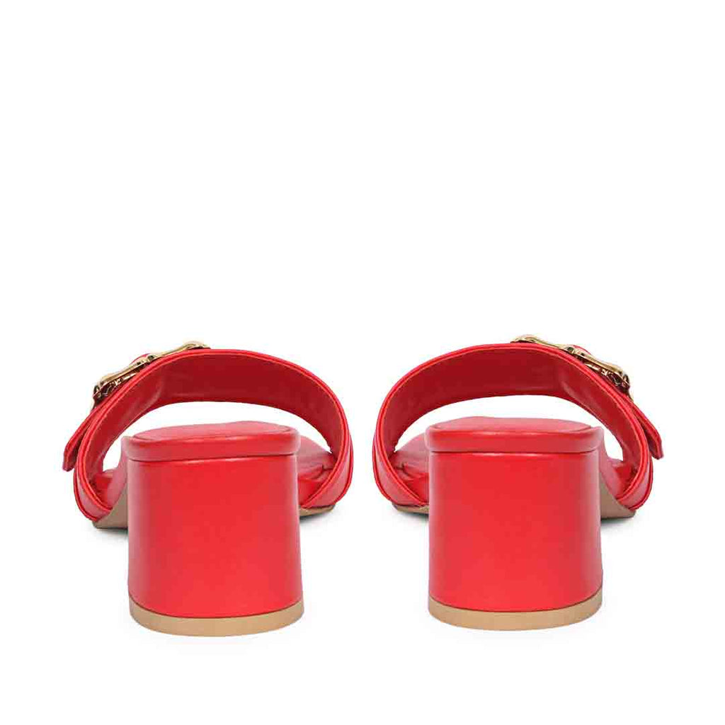 Saint Flavia Gold Square Buckle Leather Goji Berry Block Heels