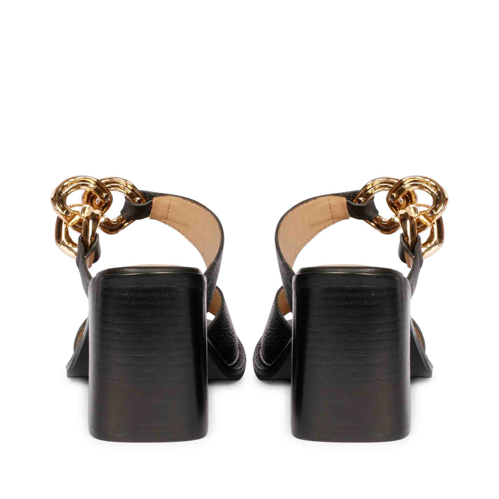 Carry an effortlessly elevated aura with these Saint Madrid blacck heels to match your confident persona. This design showcases a slip-on profile with a contemporary acrylic gold chain strap. Crafted from premium leather upper and leather lining, they are styled with open toe. The leather insoles carry the brand's well-known label. Complete with a veneer-covered high block heel.