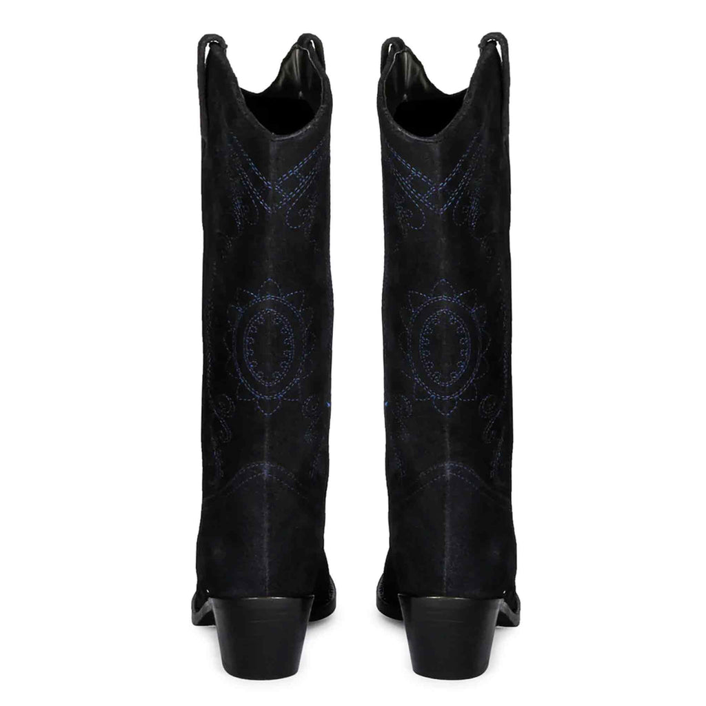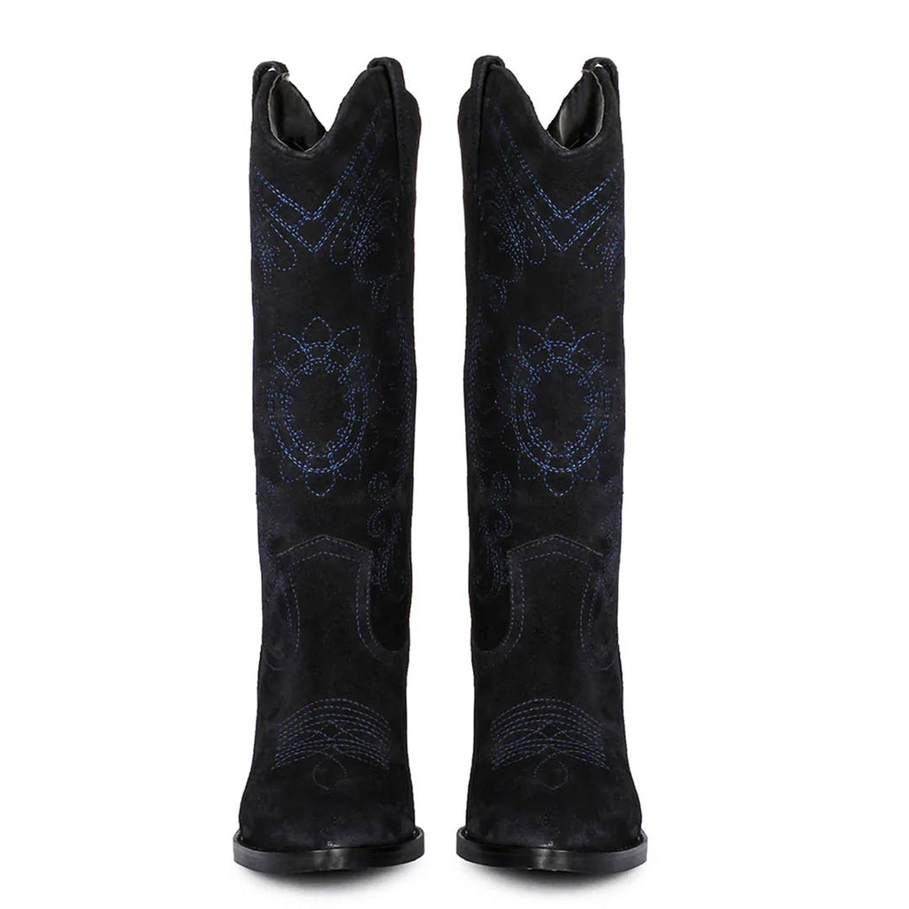 Saint Elodie, a cobalt calf length cowboy boot with full stitched suede leather upper with both side leather pull tabs and leather sole. One of the most prominent patterns on this season.