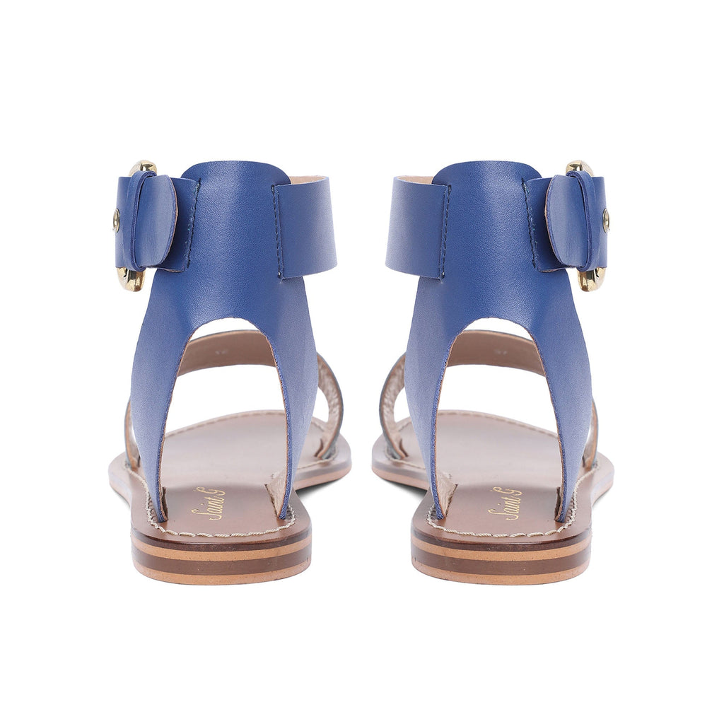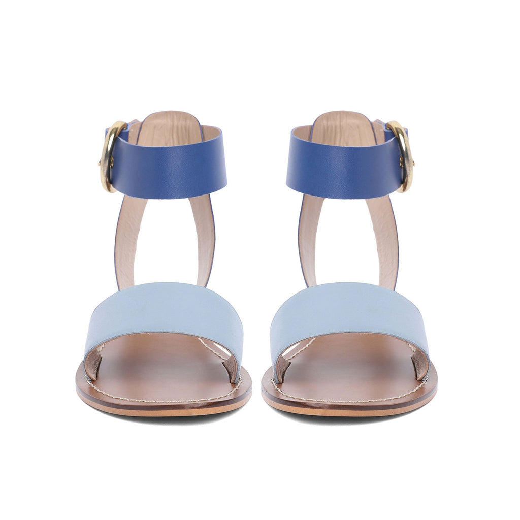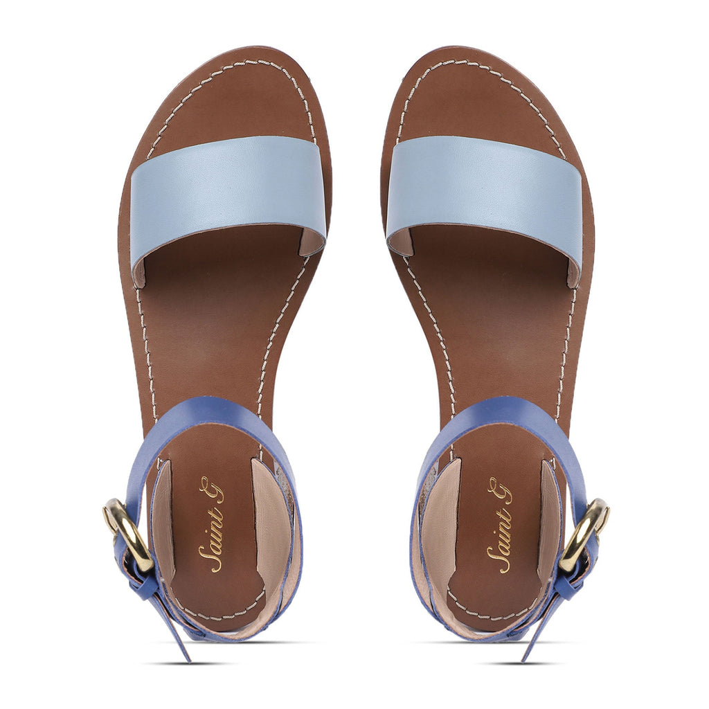 This Saint Lea blue leather sandal features an open toe asymmetrical wide strap, an ankle strap with adjustable buckle, nude leather lining, contrast stitched insole and tunit sole. The ankle strap fastens with a gold-coloured metal buckle which make these sandals really stylish and comfortable.