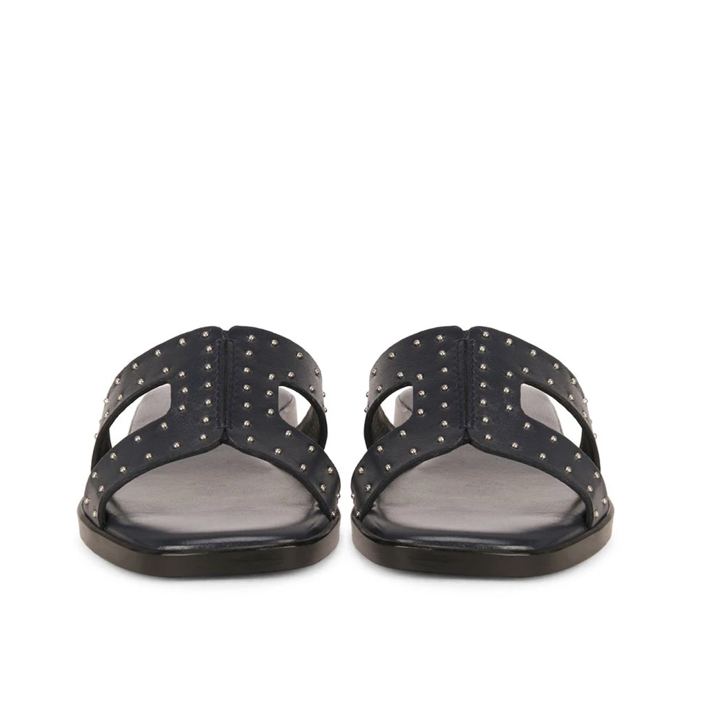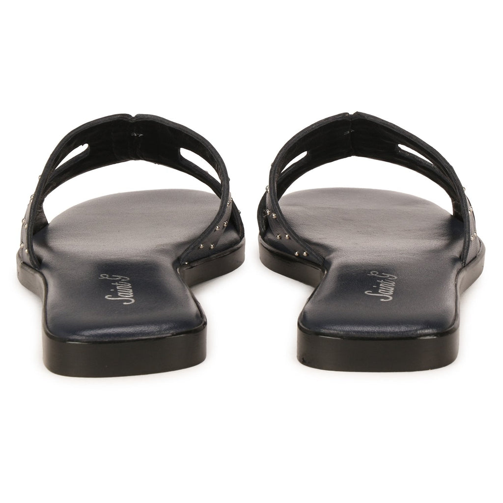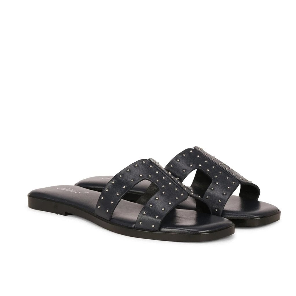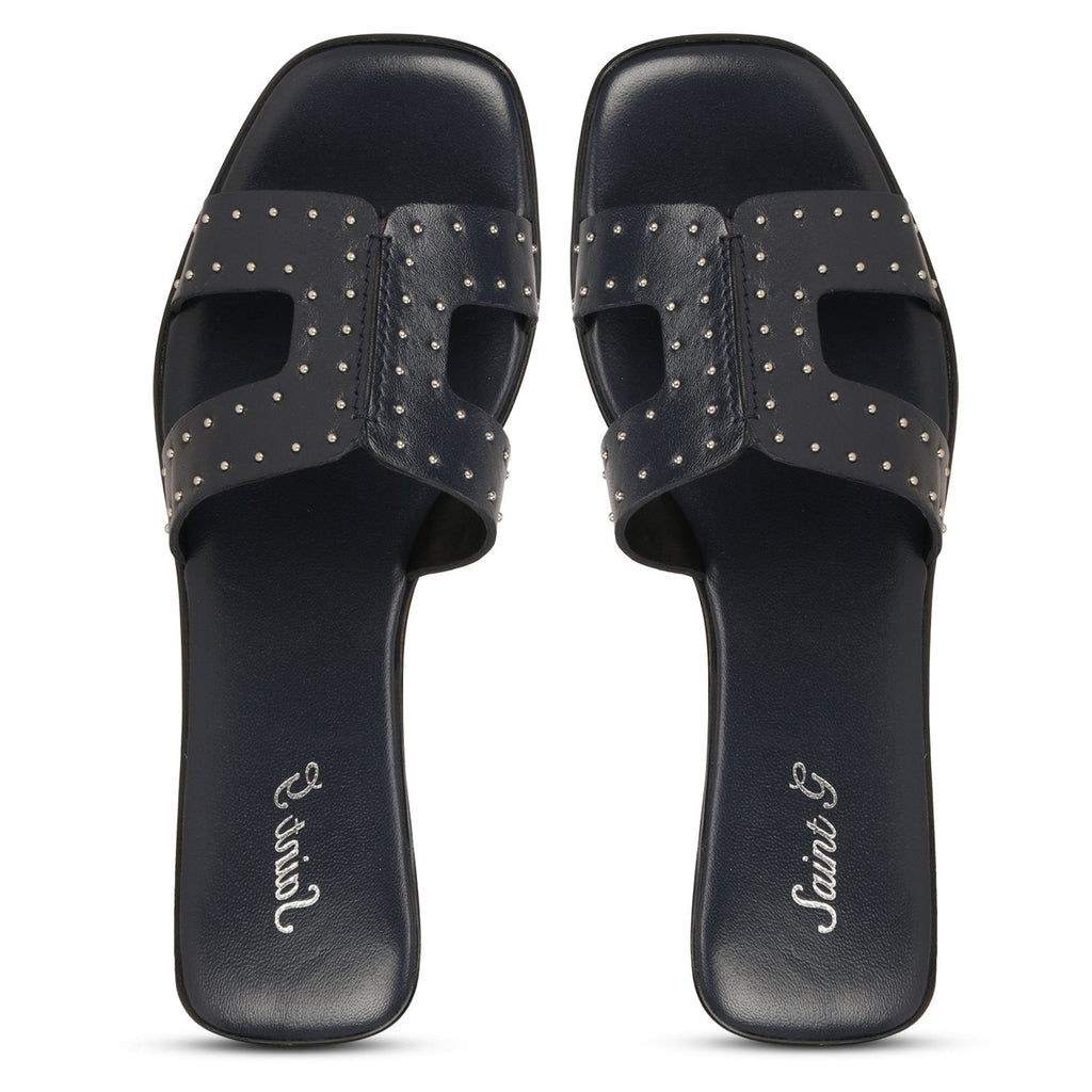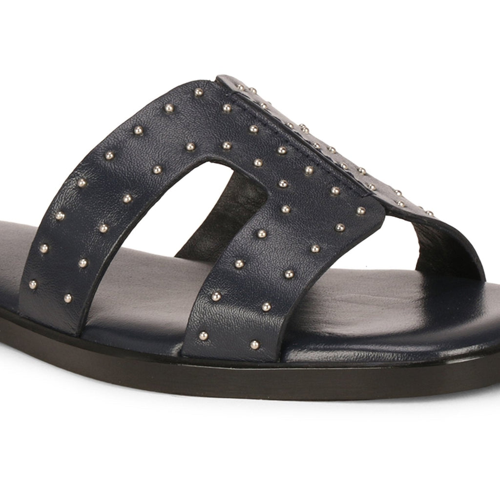 Elevate your everyday style with the dark navy leather handcrafted classic slip on design features metal studded leather upper. The embellished strap will flatter your feet and the addition of leather lining and leather footbed will provide you with all day comfort for your special occasion. complete with an open square toe. Resting on a flat tunit sole for all-day comfort. Made using quality materials and finished with trending details.