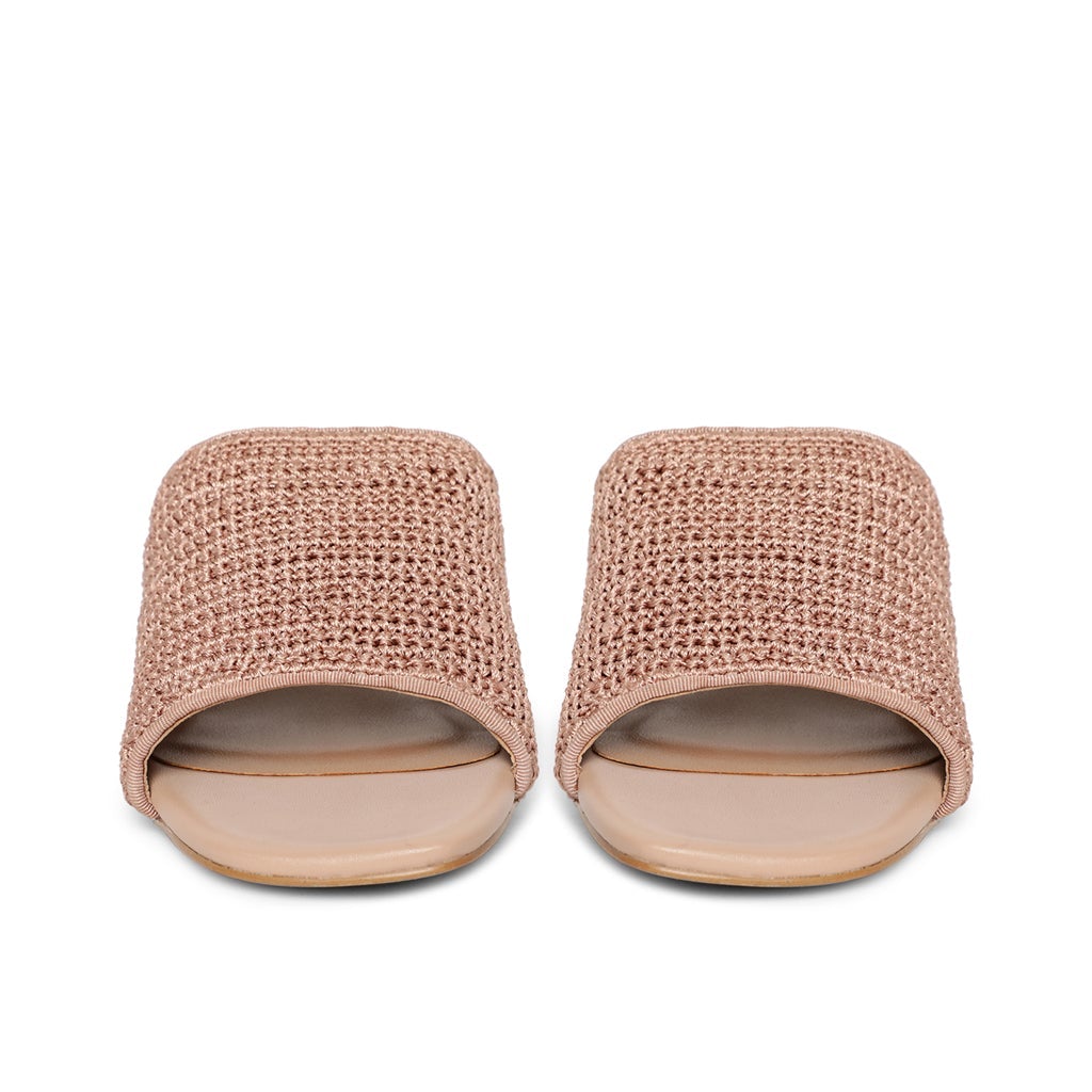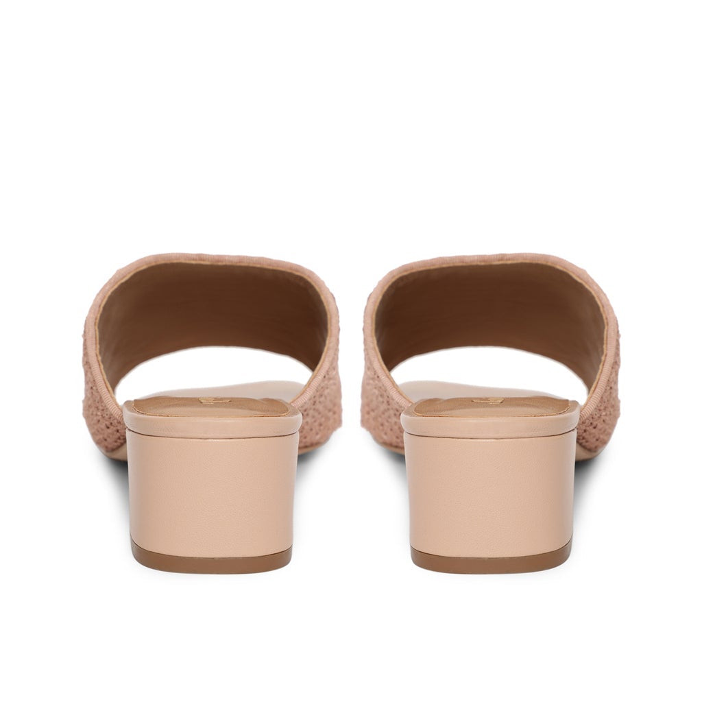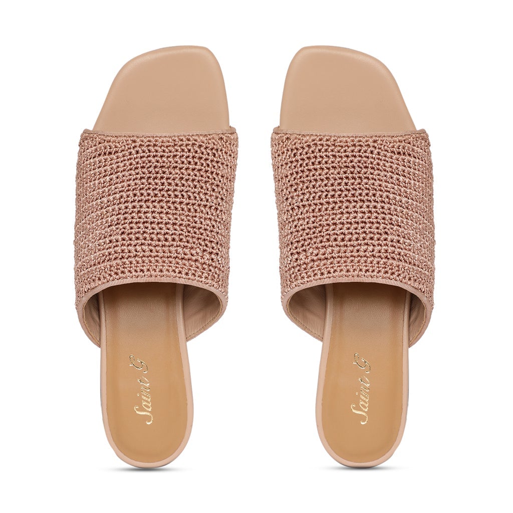 Make a dazzling fashion statement with these beige woven leather and fabric upper mid block heel sandals. Expertly handcrafted with an upper woven with leather lining, leather footbed, this leather covered block heel mule is your versatile summer shoe. A slip on style with an open and square toe, wear yours with everything from jeans to dresses.