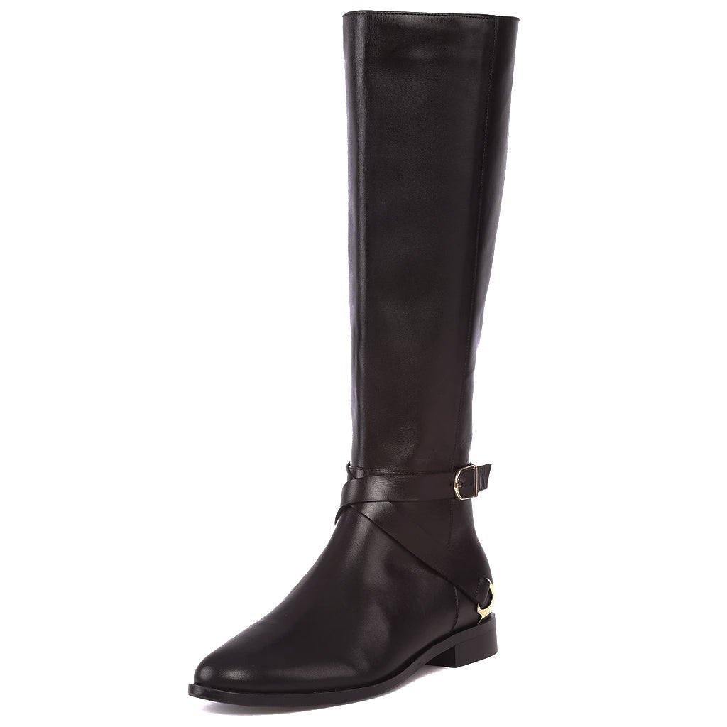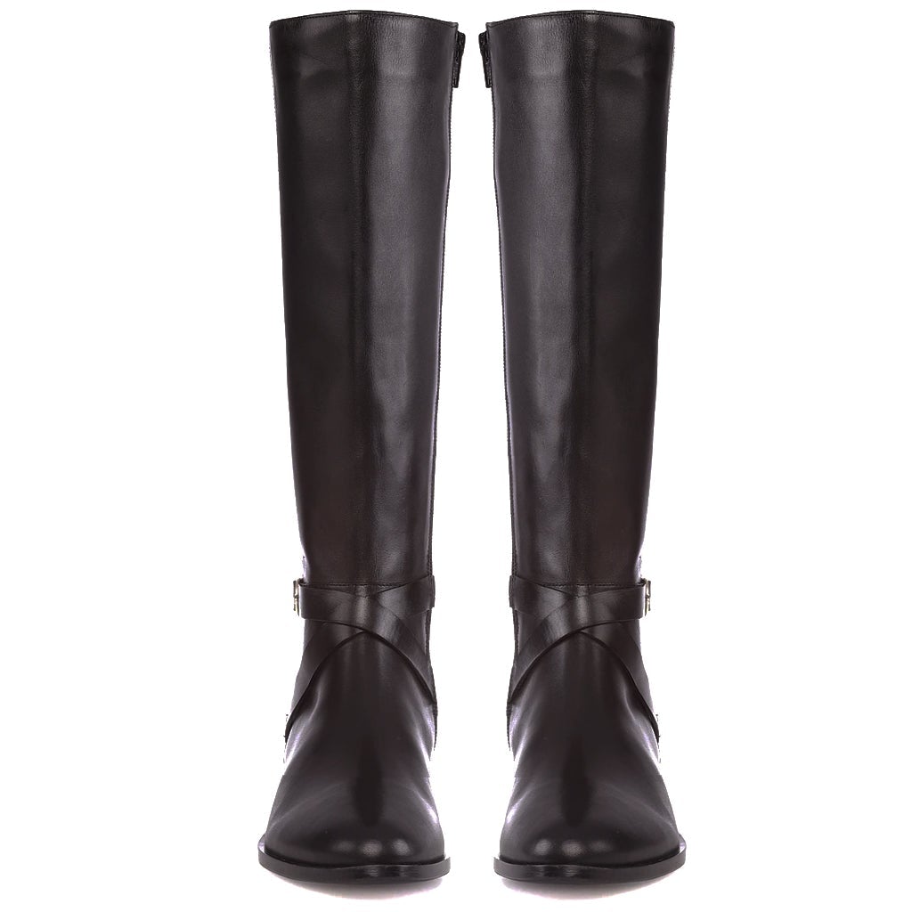 Sophistication and style go hand-in-hand when it comes to SaintG latest collection. These knee high long boots are crafted from black crust leather, featuring an inside zip fastening, soft leather and fleece lining, padded leather socks. Showcasing with gold metal trim and a buckled wrap strap. The Height of the Boot is-16.6 Inches approx. These boots showcase an asymmetric zip and buckle detailing.