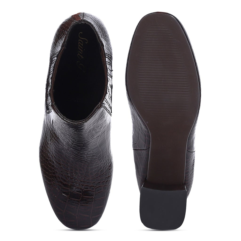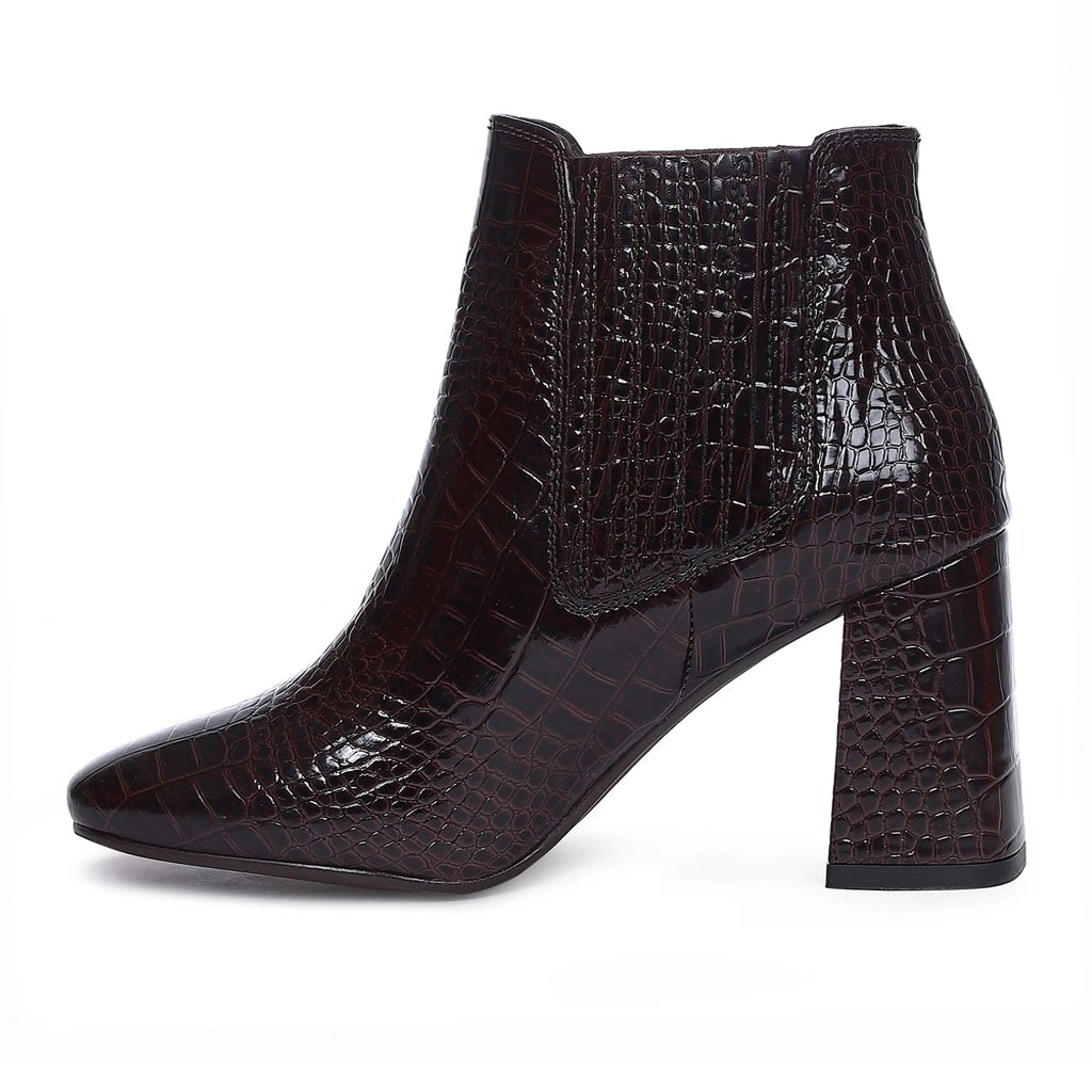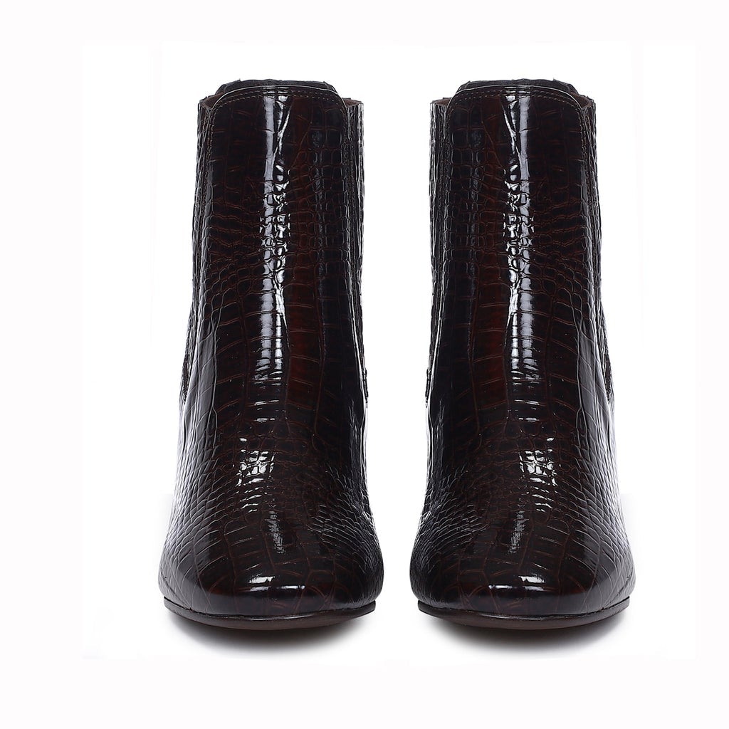 Meet Saint Edwina, A classic handcrafted croco embossed brown vegan Leather ankle boots with 3 Inches covered block heels, has a slip on closure. Featuring leather covered elasticated side panels to ensure comfortably slip them on and off. Its complete with leather lining and padded leather footbed.