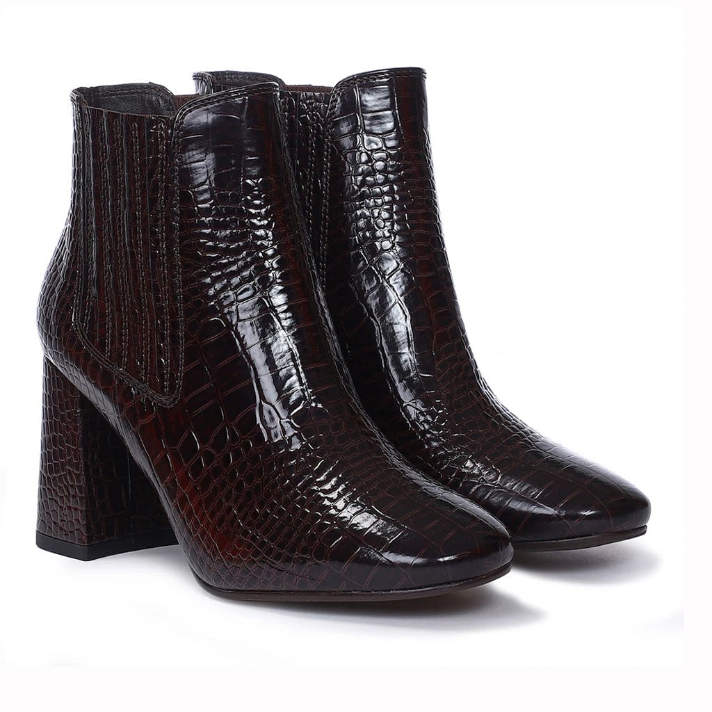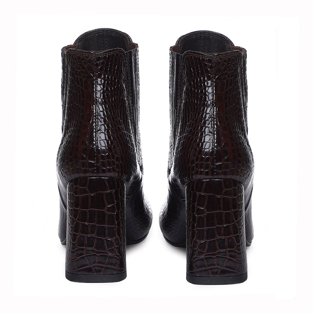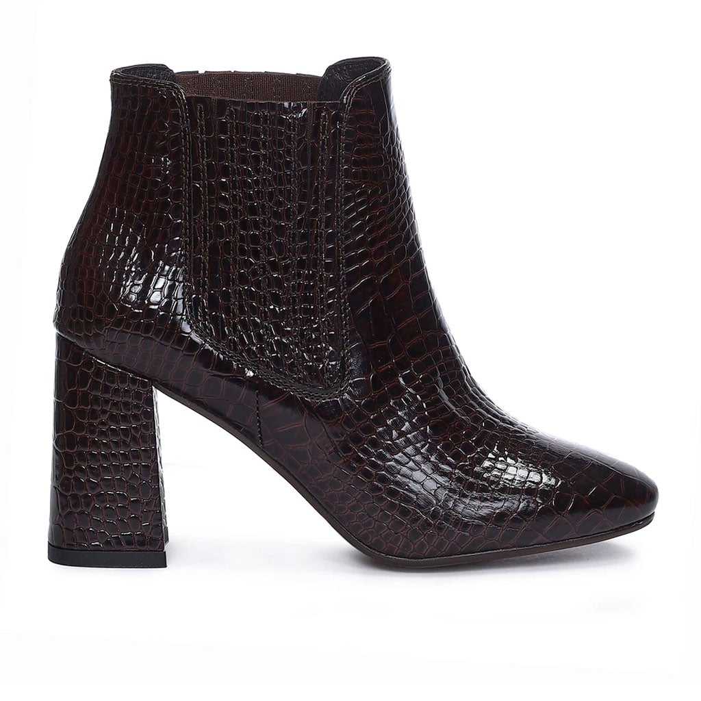 Meet Saint Edwina, A classic handcrafted croco embossed brown vegan Leather ankle boots with 3 Inches covered block heels, has a slip on closure. Featuring leather covered elasticated side panels to ensure comfortably slip them on and off. Its complete with leather lining and padded leather footbed.