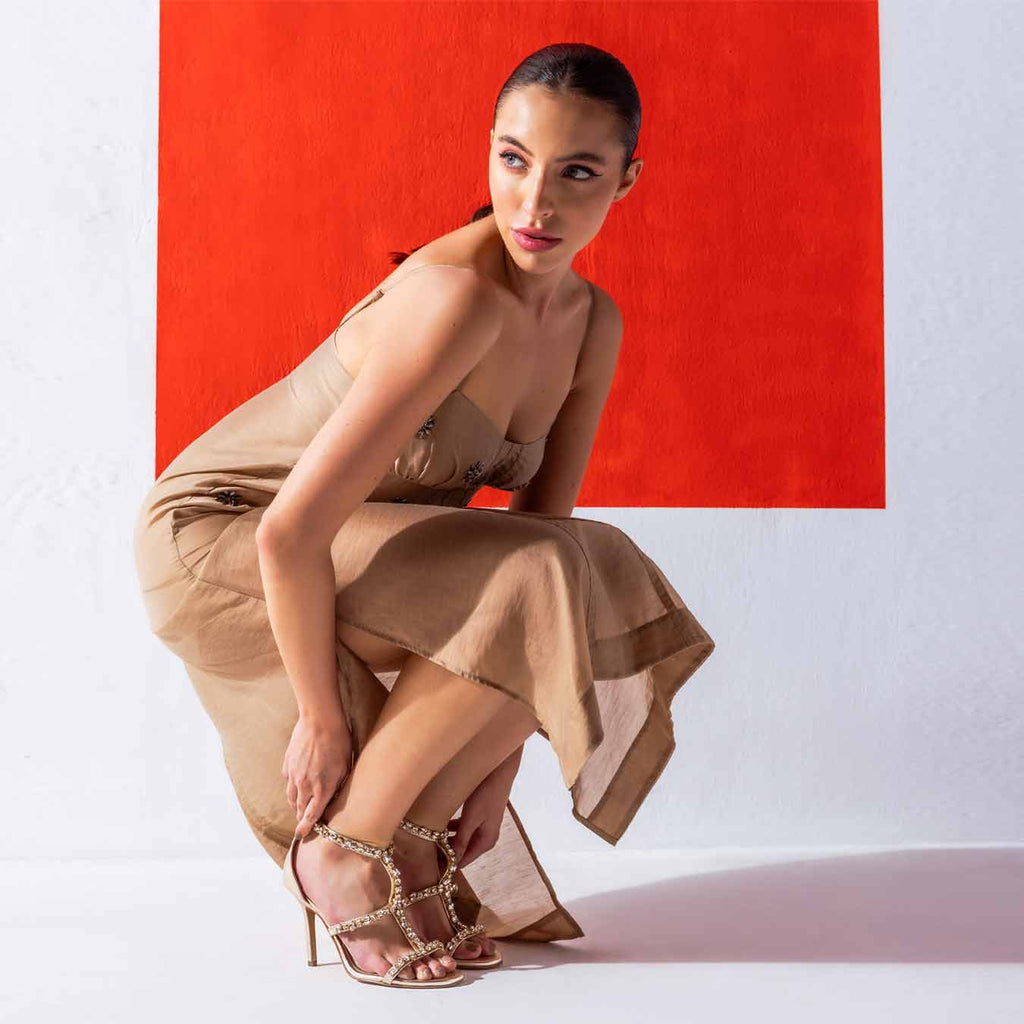 Introduce contemporary glamour to your look with the Ella stone cage heel from SaintG. They are styled with back zip closure and rest on a covered stiletto heel, crafted from the gold metallic leather upper and leather lining. Branding done on padded leather insole. These are the epitome of high fashion, combining timeless style with impeccable craftsmanship.