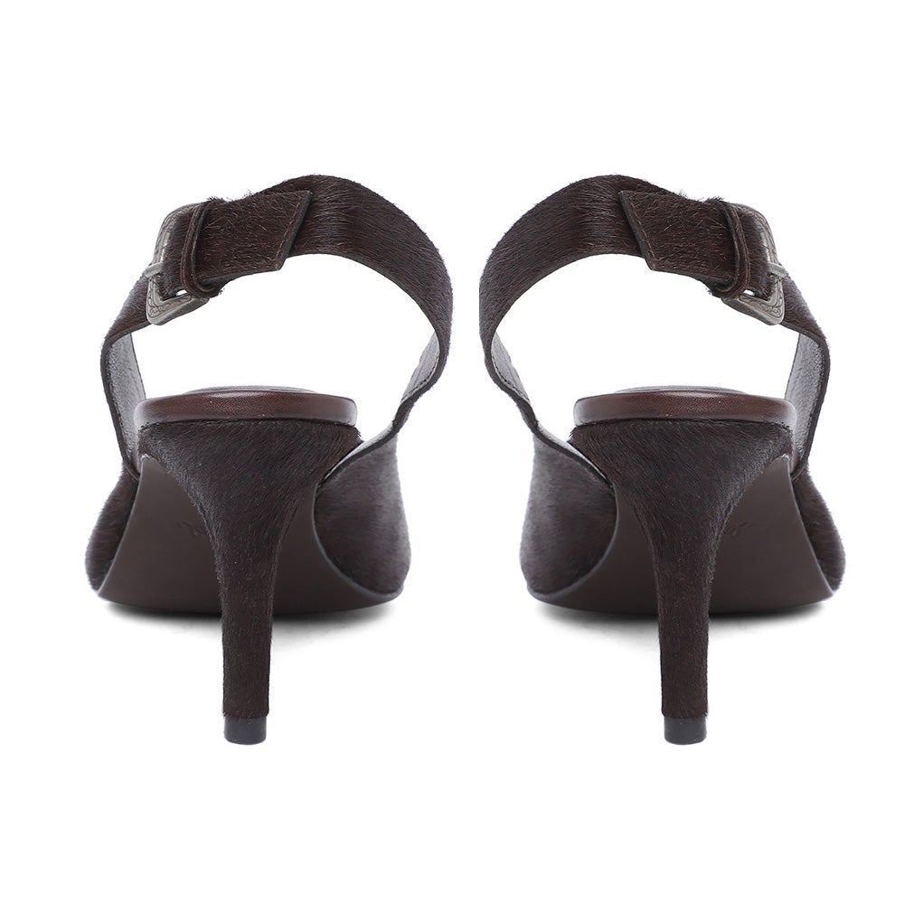 This pair of sandals is crafted in brown pony hair leather rests on a kitten heel to complement your classic evening looks, Finished with an adjustable decorative buckle fastening on the slingback, a covered stiletto heel completes the style, leather lining, leather insole with tunit sole. Celebrate the arrival of new occasions, contrast yours with a silk slip dress for a luxe finish.