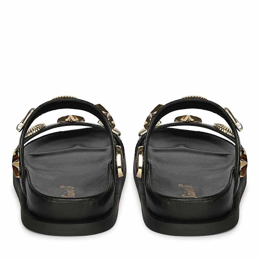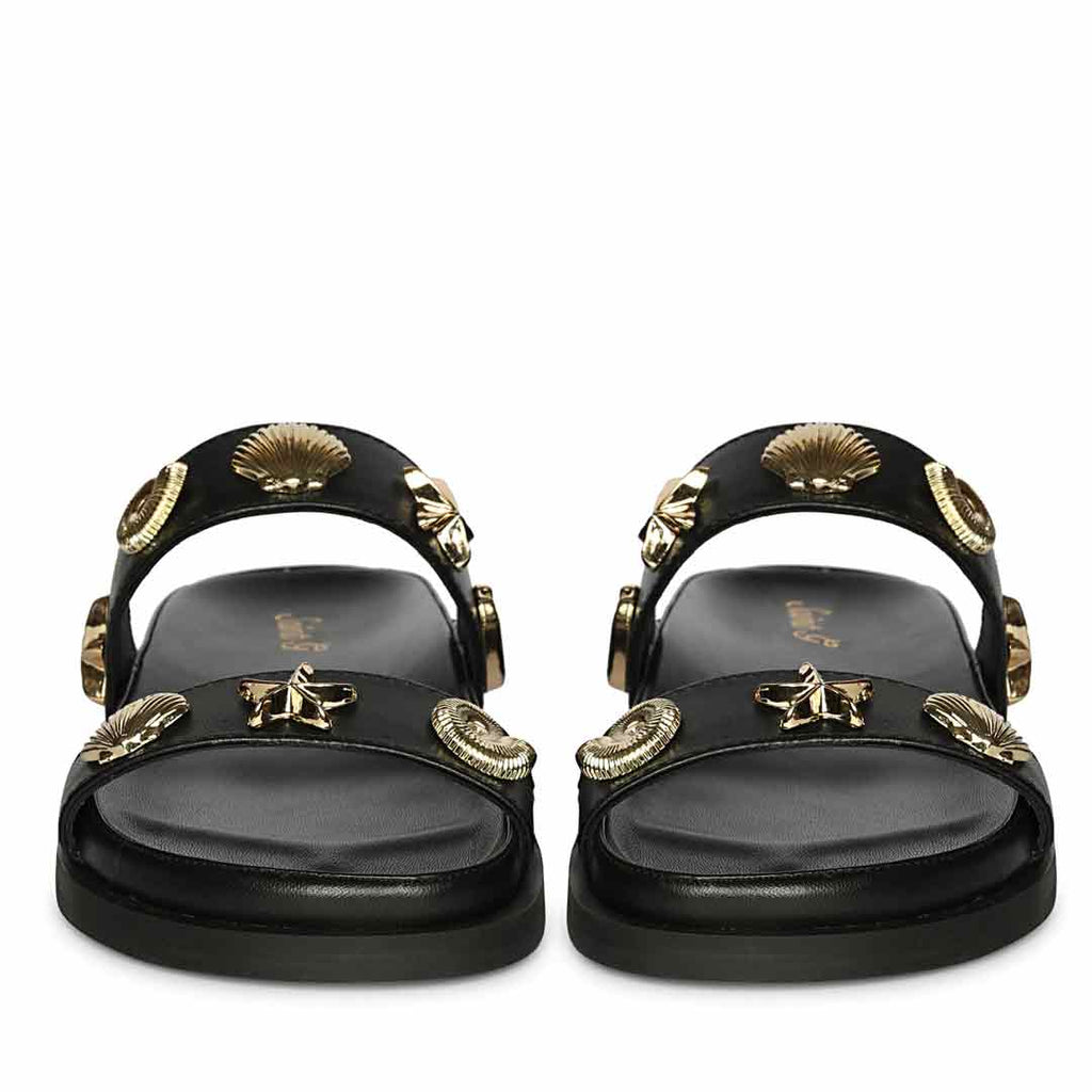 Adorned with Gold Metal Seashell & Star Studs, the Saint Hallie Leather Sandals feature a sleek Black Leather upper, soft Leather lining, cushioned Leather insole, and a durable Black TPR sole. Easy to slip on, these sandals are perfect for any search for trendy and stylish footwear.