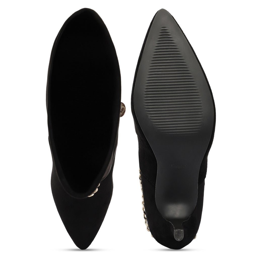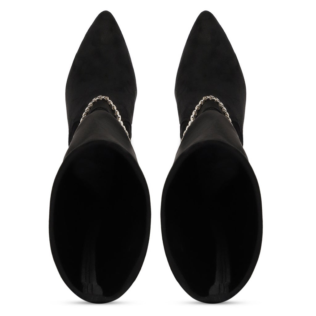 The Idalia black stretch suede knee high boot is a luxury that cleverly combines a stylish youthful outlook. Embellished with a detachable gold tone chain at ankle that promises to add a subtle shine to any outfit. These knee high boots has a black stretch suede upper and a pointed toe to add a touch of style to your everyday look. Made from the finest materials and finished with trending design details. Features a covered stiletto heel, stitching details with paneled finish. complete with leather insole, leather lining and tunit sole.