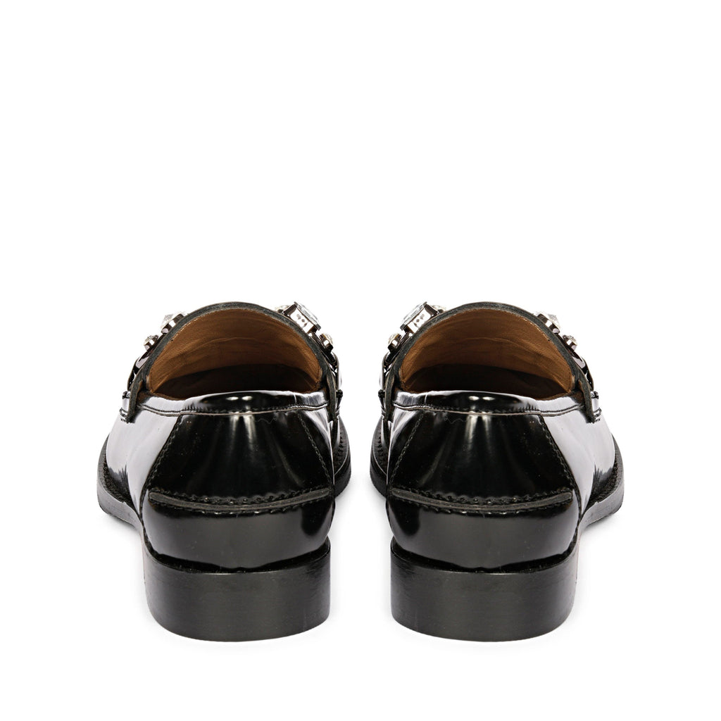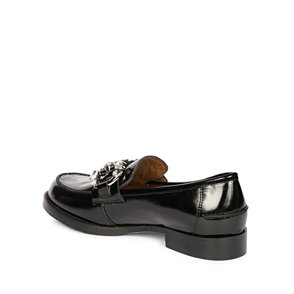 LIVIA CRYSTAL HORSEBIT EMBELLISHED BLACK ABRASIVATO LEATHER MOCCASINS,