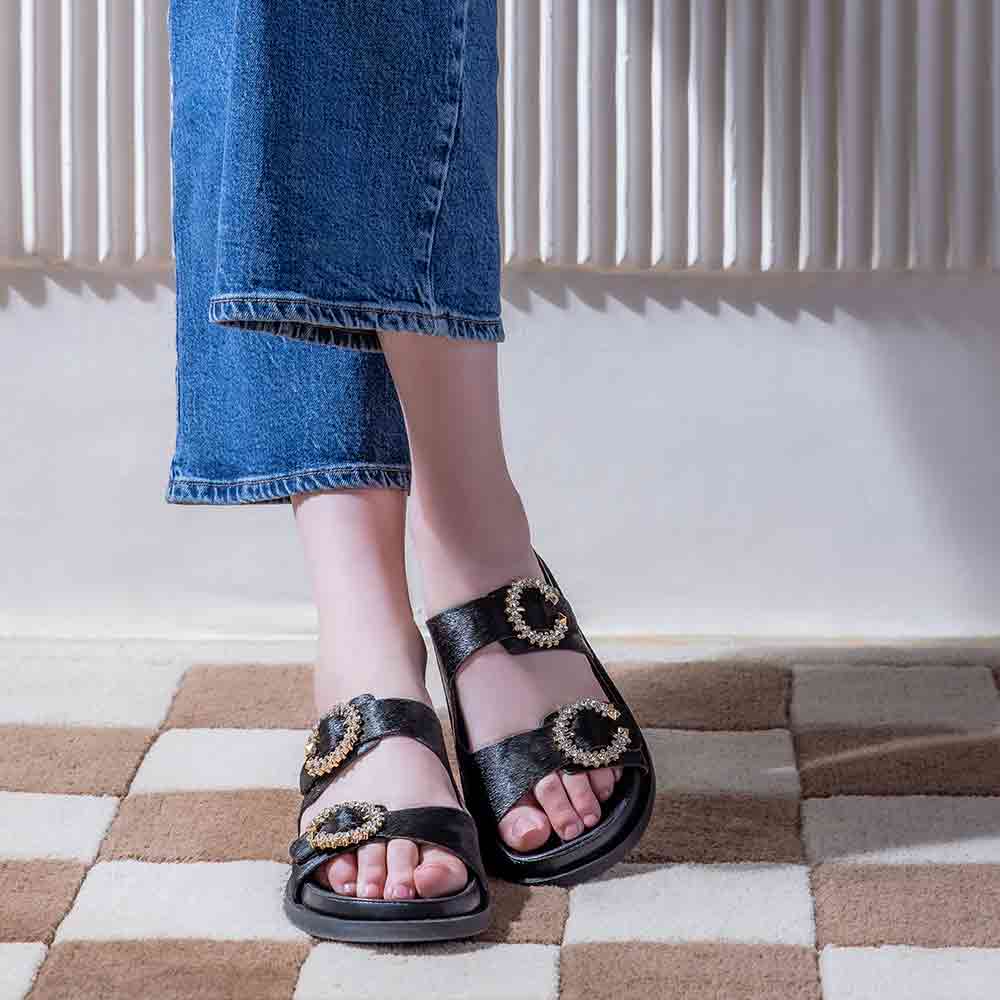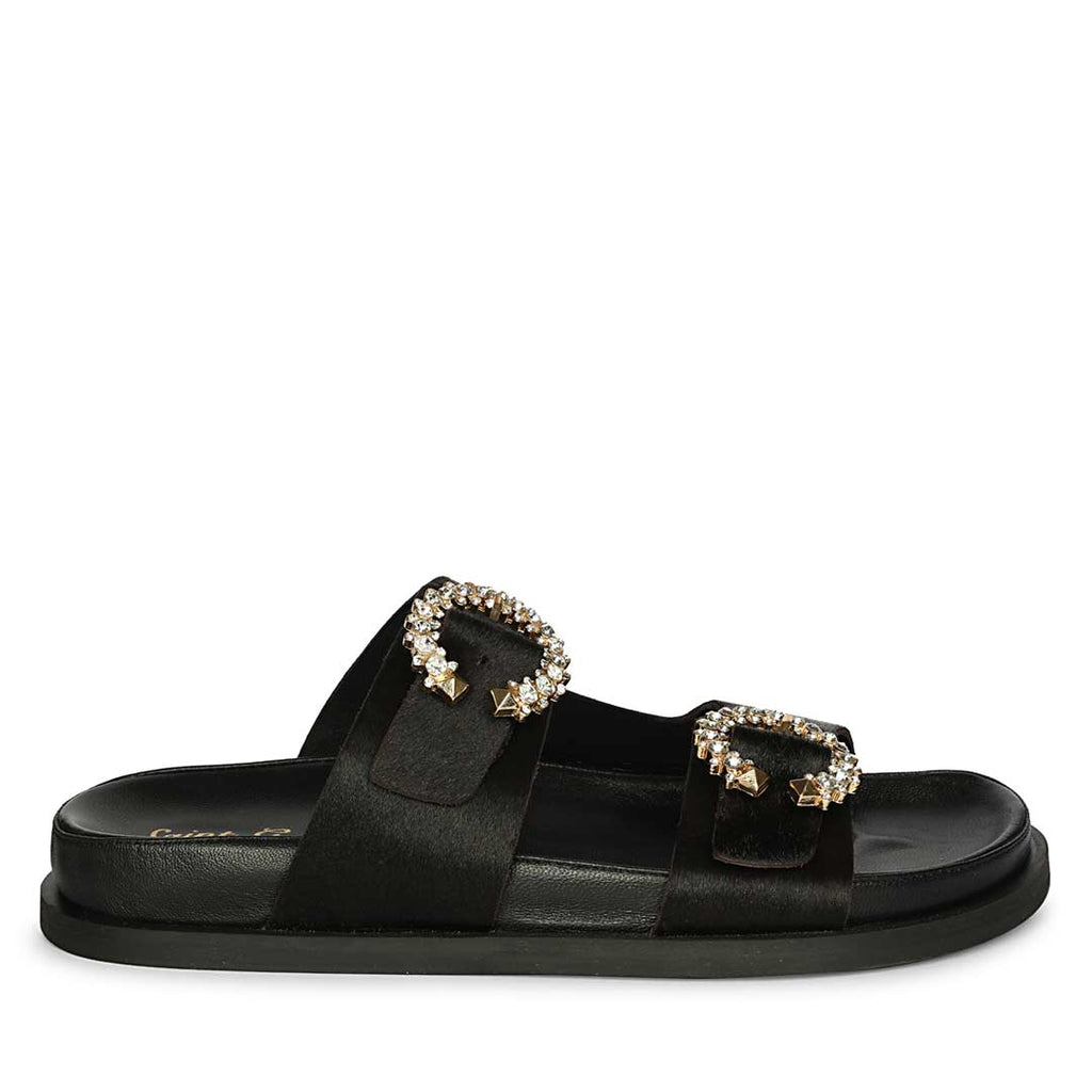 Saint Marta Jewel Pin Buckle Black Hair On Leather Sandals