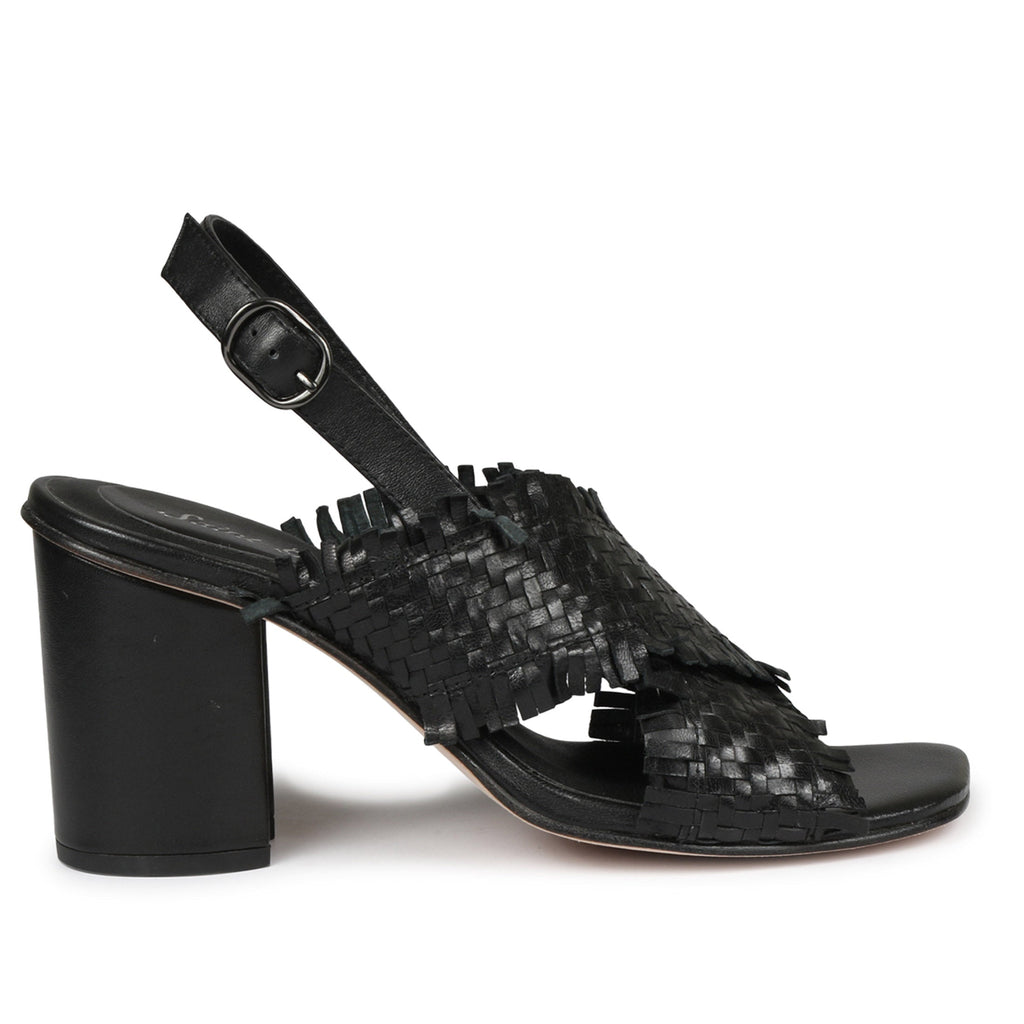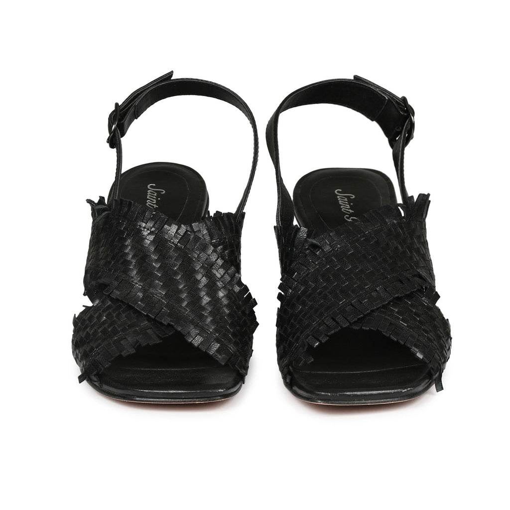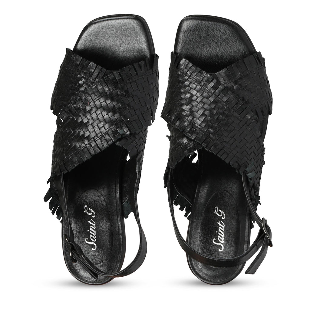A pair of black open toe sandals, has mid-top styling, back strap.
