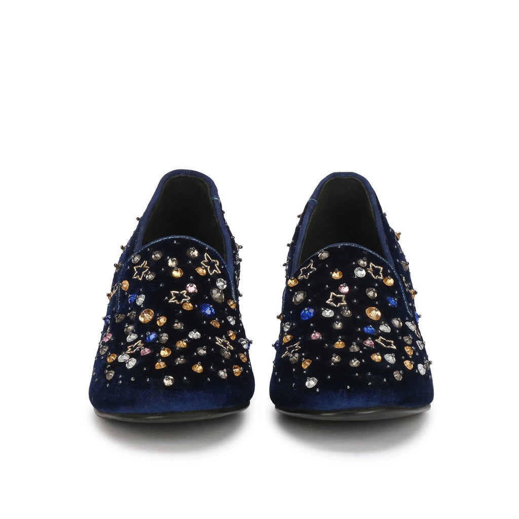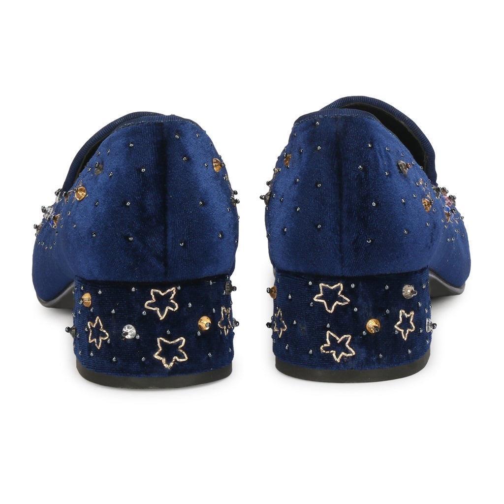 The Olivia pumps are made for the woman that loves to make an eye-catching entrance, Featuring blue suede upper with hand embroidery and sparkling crystals, leather lining, leather insole with tunit sole. has an embroidered mid block heel.