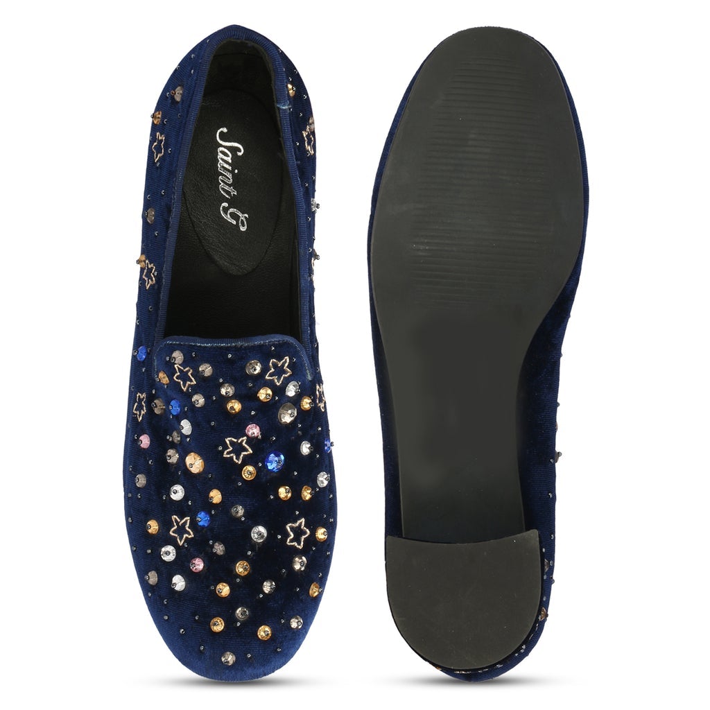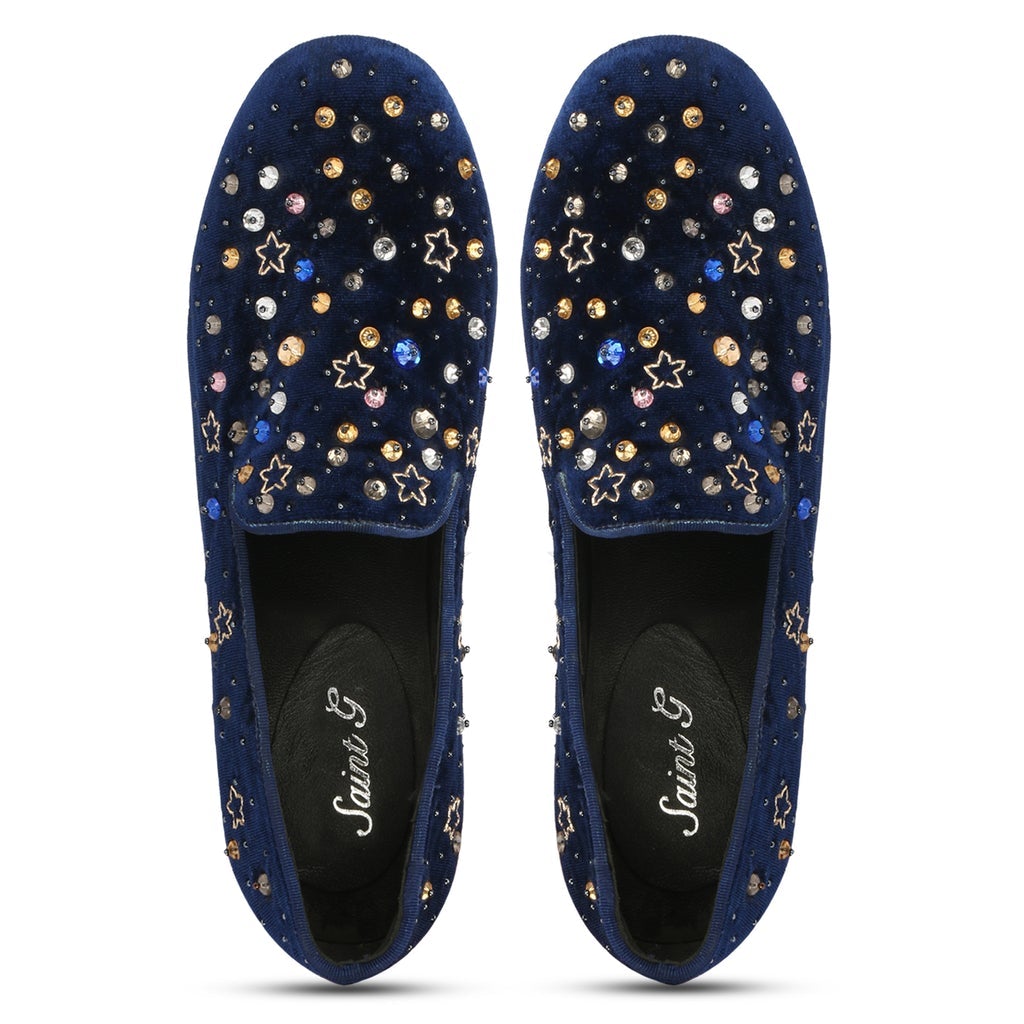 Saint Olivia Hand Embroidered Blue Suede Pumps