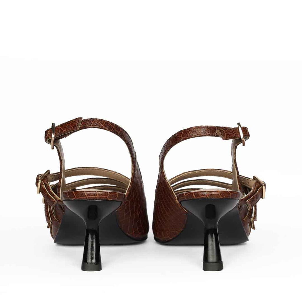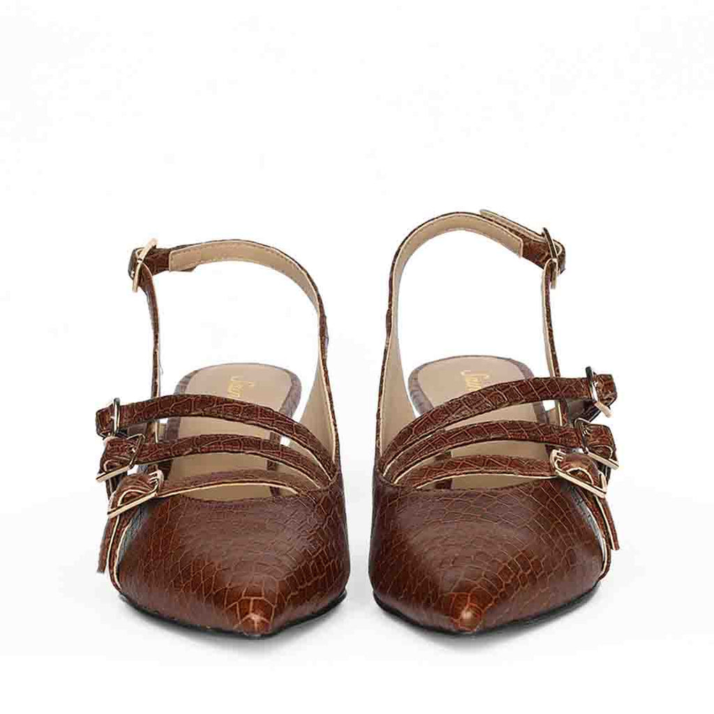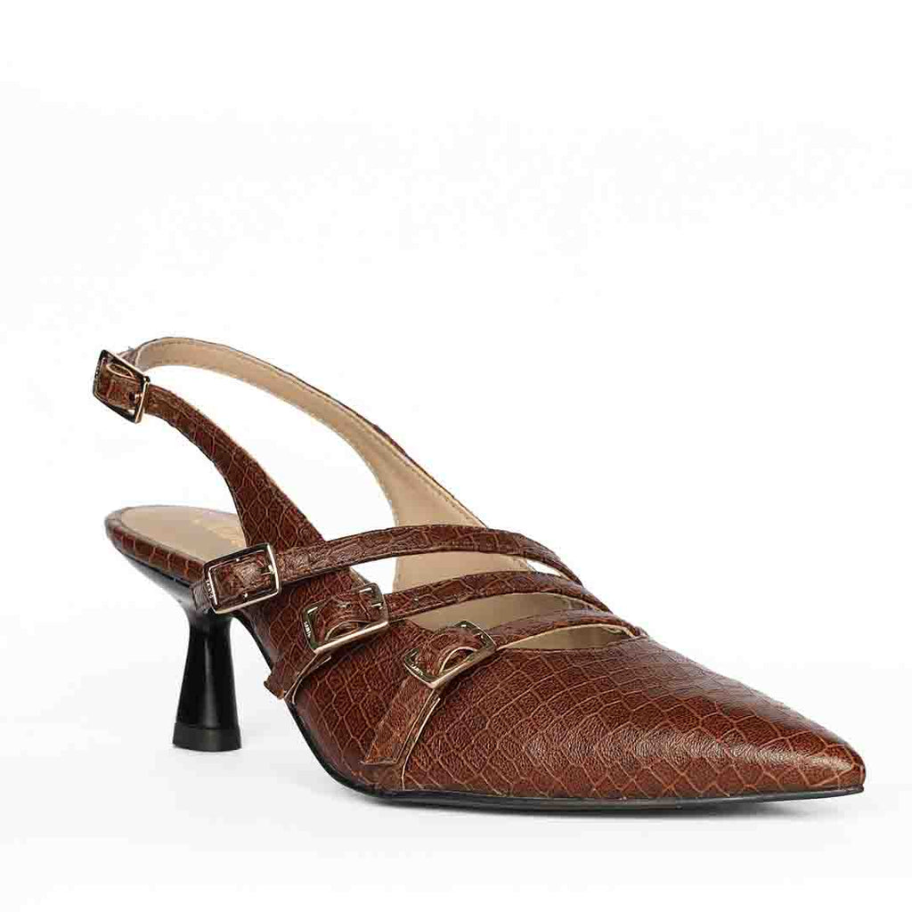 Add a bold touch to your wardrobe with the Saint Kayla Buckle Strap Brown Croco Pumps.