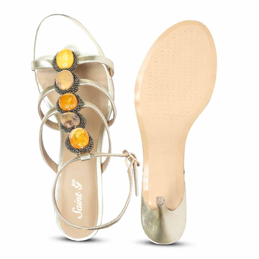 Put a sparkle in your step with these dazzling multi-color stones adorned gold stilettos! These premium leather stilettos from SaintG feature a unique cage design and are embellished with multi-colored stones. Expertly crafted, these luxury Stilettos are perfect for adding a touch of style and sophistication to any outfit. Get ready to turn heads with these statement heels.