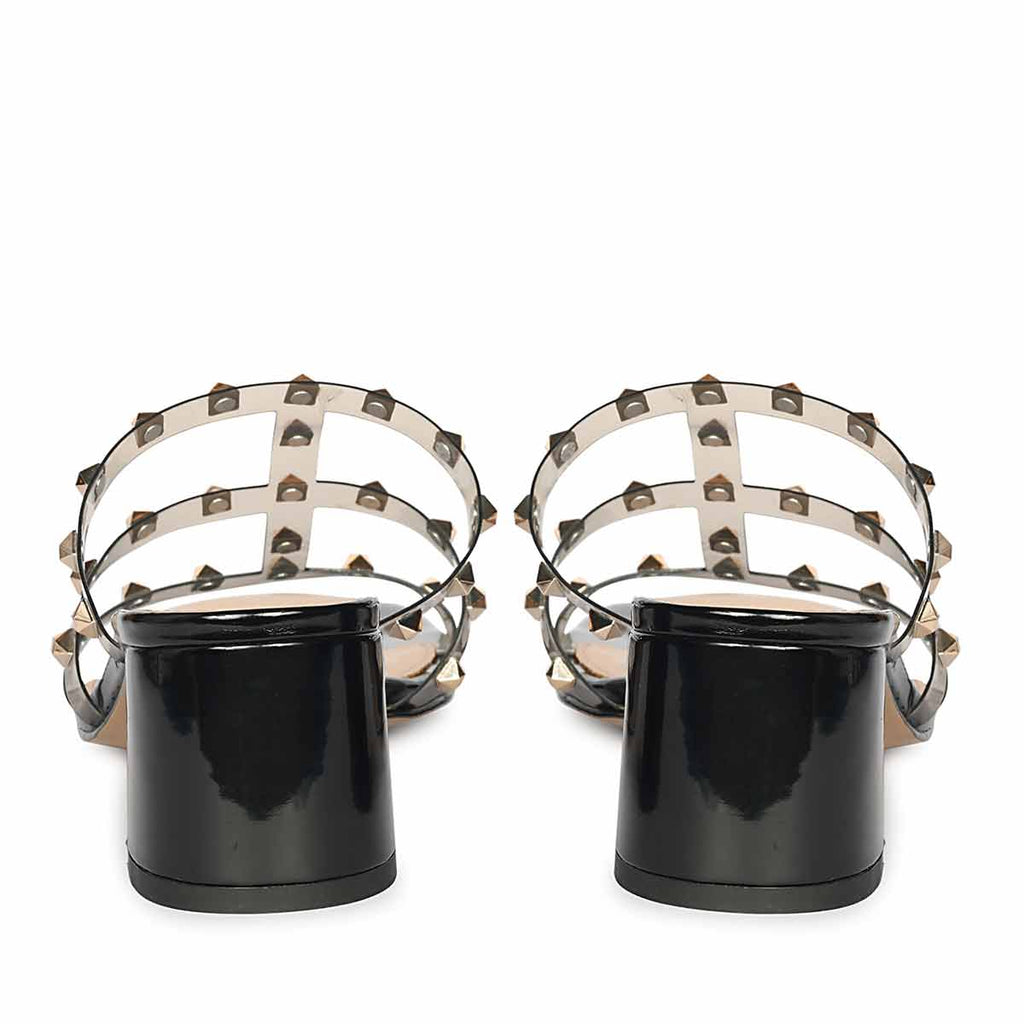 Edgy refinement defines the Novara Heels, where clarity meets strength. The transparent TPU straps are traced with polished metal studs, creating a striking interplay of modern minimalism and rebellious glamour. Balanced on a block heel, this silhouette speaks to both structure and fluidity, offering an architectural profile that stands out effortlessly. Designed for bold evenings and contemporary styling, Novara is a statement of confident elegance.