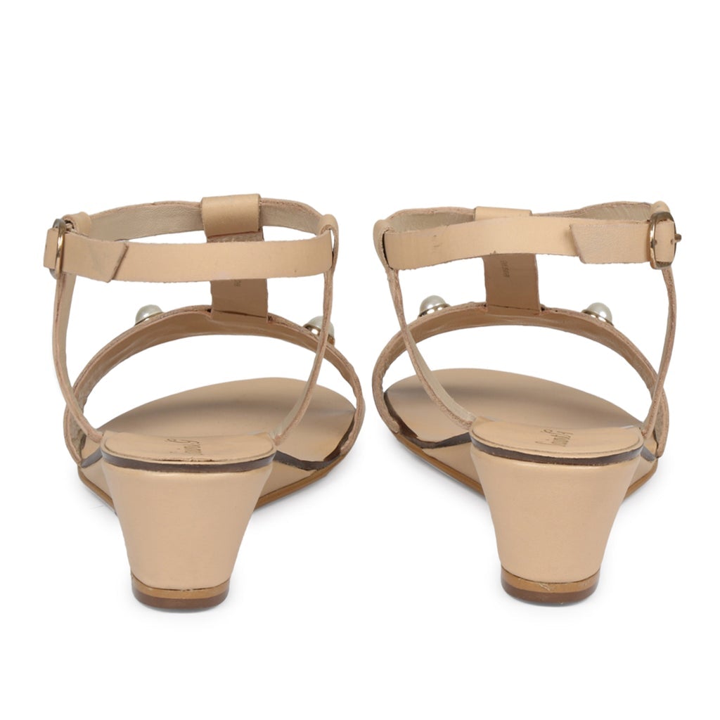 A pair of beige toned open toe sandals with pearl , has regular styling, ankle loop detail.