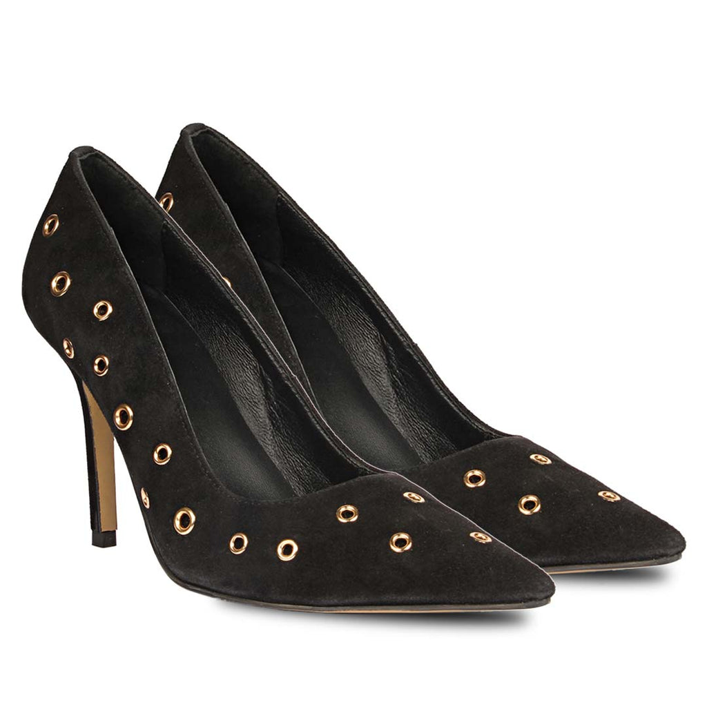 Saint Remi Eyelet Embellished Black Suede Leather Pumps