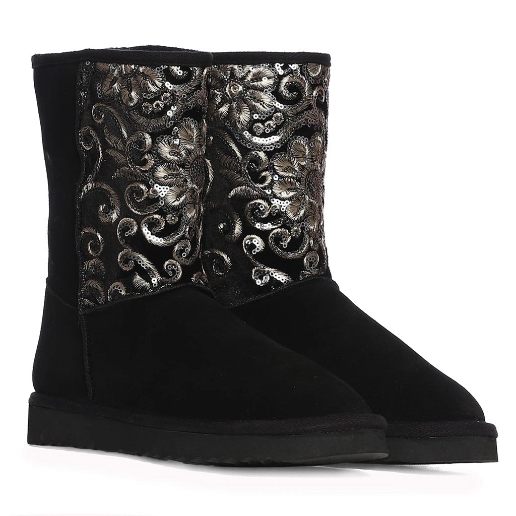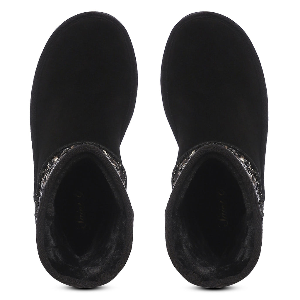 Grow your stylish wardrobe with a pair of trendy snug boot from SaintG. This black hand embroidered sequins fabric boot looks best with any winter outfits.