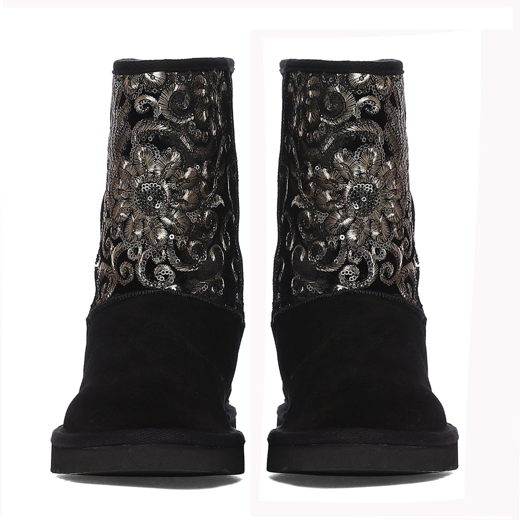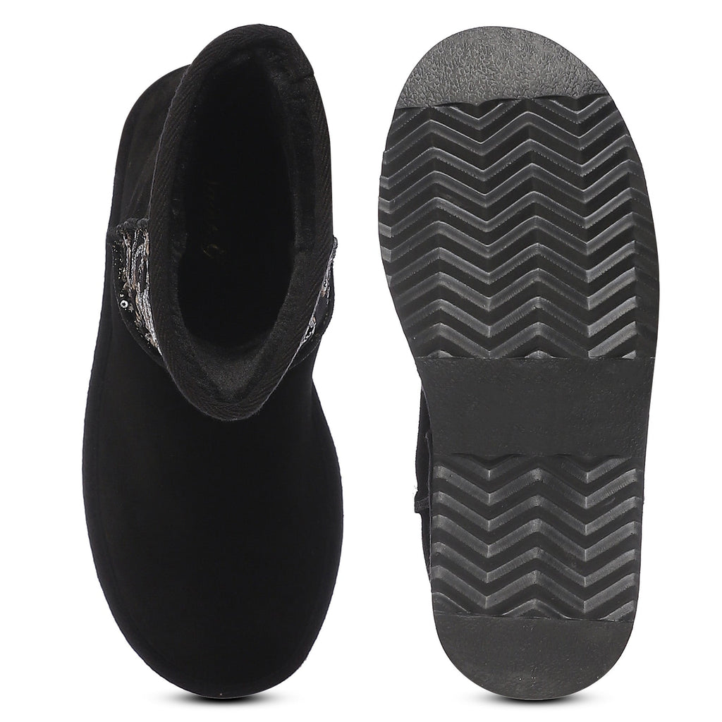 Our Saint Corah snug boots are embellished with luxuriant black sequins over an embroidered suede leather. These snow boots are designed with fur lining and fur insole to keep your feet warm while you have fun. Enjoy your step with super comfortable & flexible rubber sole.