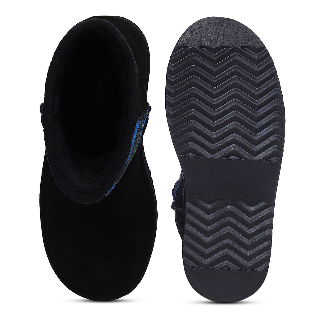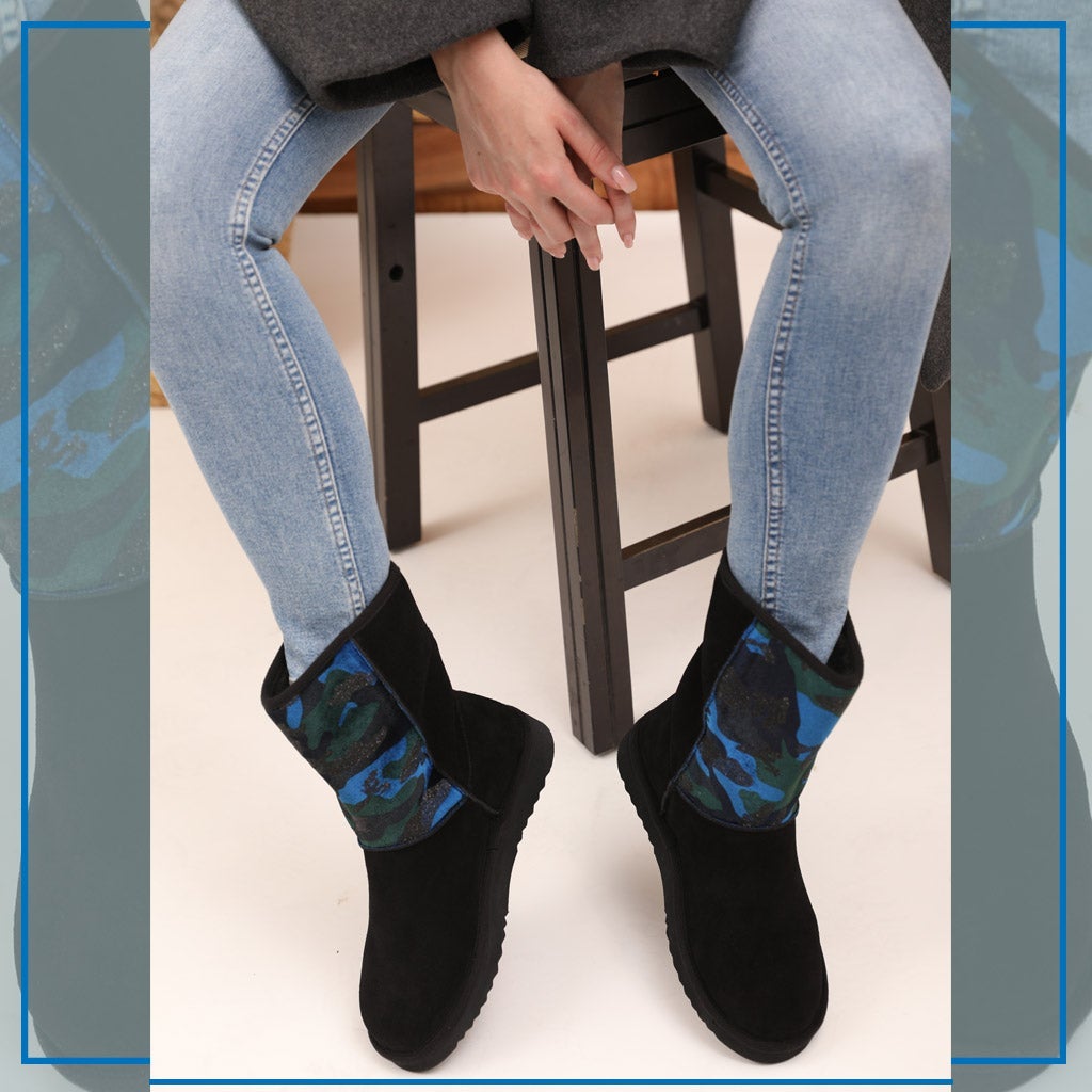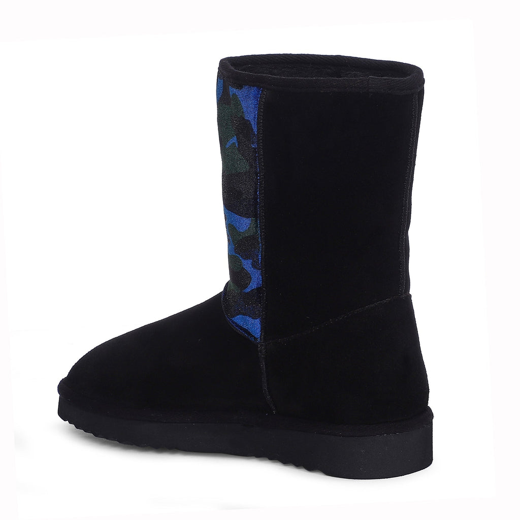 The dazzling, black suede leather and navy camo fabric snug boot will instantly give your winter look a fun party vibe. These boots are designed with fur lining and fur insole to keep your feet warm while you have fun. Enjoy your step with super comfortable & flexible rubber sole.