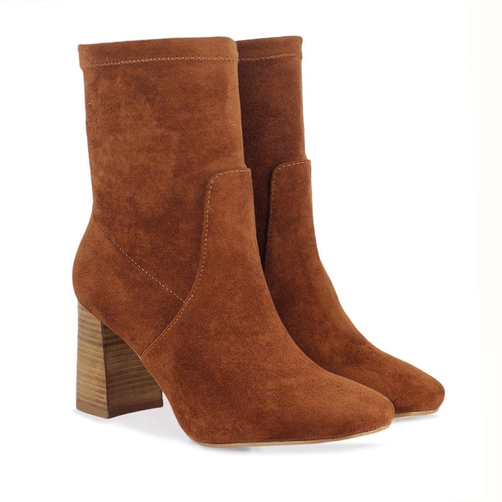Grow your stylish wardrobe with a pair of tan stretch suede high ankle boot from SaintG. It comes with veneer Leather covered heel and padded leather footbed for natural comfort and breathability. This block heel boot will lend a stylish look to your outfit.
