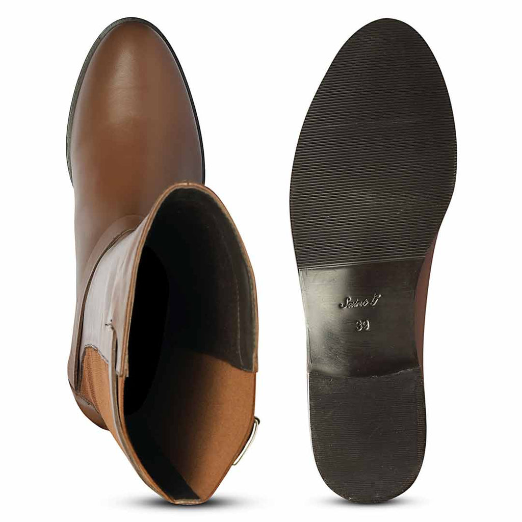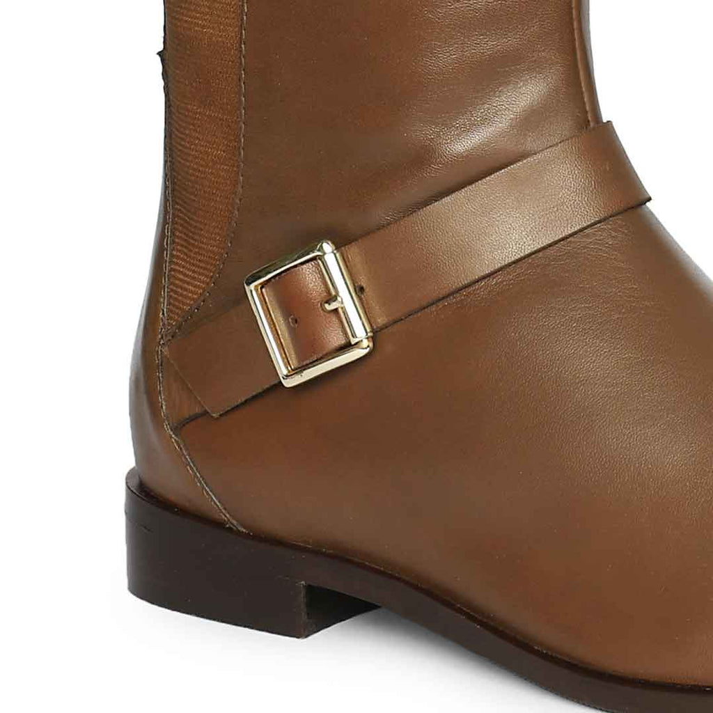 Get complimented for your rich sense of style by wearing this brown leather knee high long boots from SaintG Luxe. Showcasing with gold color buckled wrap strap, soft and breathable leather lined for a luxurious feel, padded leather footbed provides lasting comfort. Featuring elasticated back panel for the perfect fit around the calf, the pull on closure to ensure comfortably slip them on and off. These great-looking strappy boots feature a classic western style. It accented by an extra buckle strap at the top of the shaft. these premium quality leather boots are constructed using an anti skid handmade tunit sole. Finished with a rounded toe.