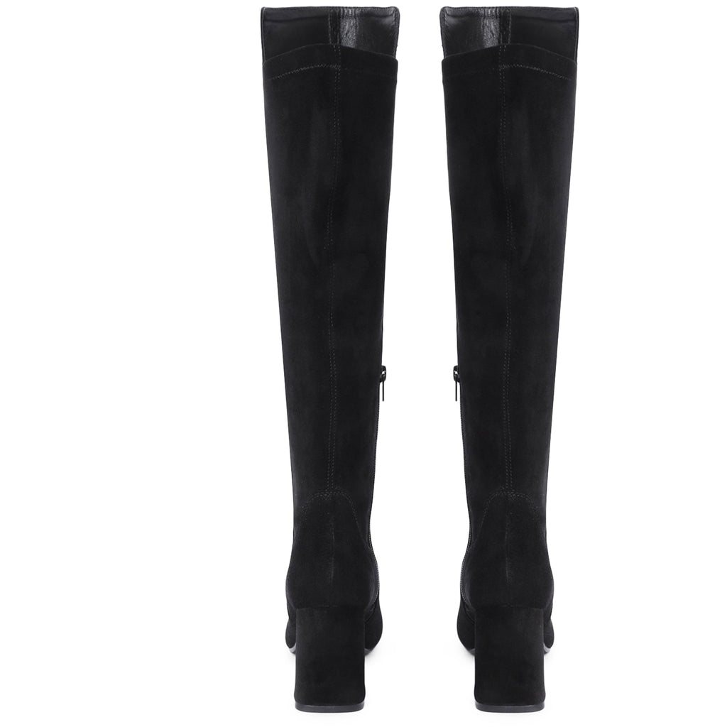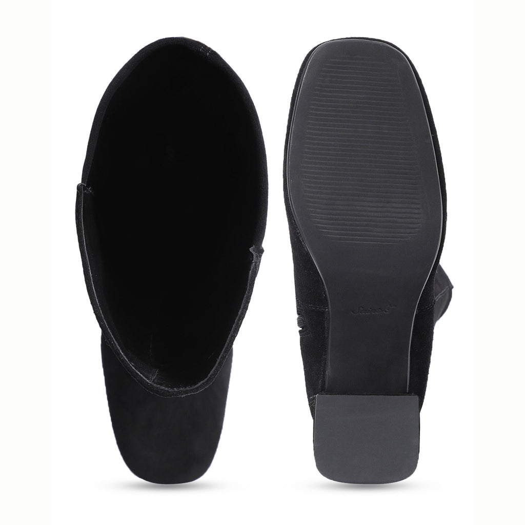 These black boots are crafted from 100% genuine leather with back stretch suede, raised front, fleece and leather lining for a luxurious feel, padded leather footbed provides lasting comfort. Featuring back stretch suede for the perfect fit around the calf, an inside zip closure to ensure comfortably slip them on and off.