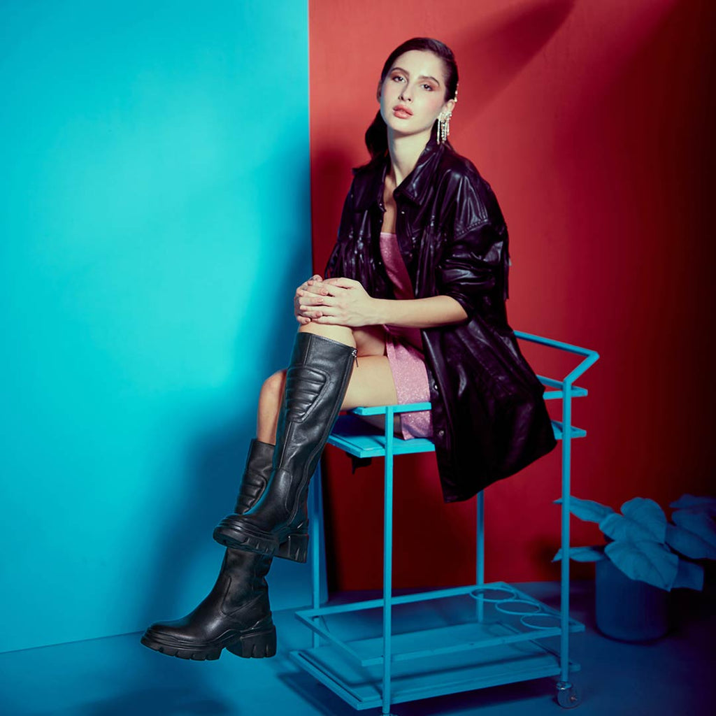 Add these Eloïse black leather inside zipper to your wardrobe for an easy way to rock an edgier look! Crafted in crust leather, leather & fleece lining and branded leather insole, these knee high boots have a rounded toe and are fastening with Inside zip. The gorgeous boot sit on a black EVA lug sole.