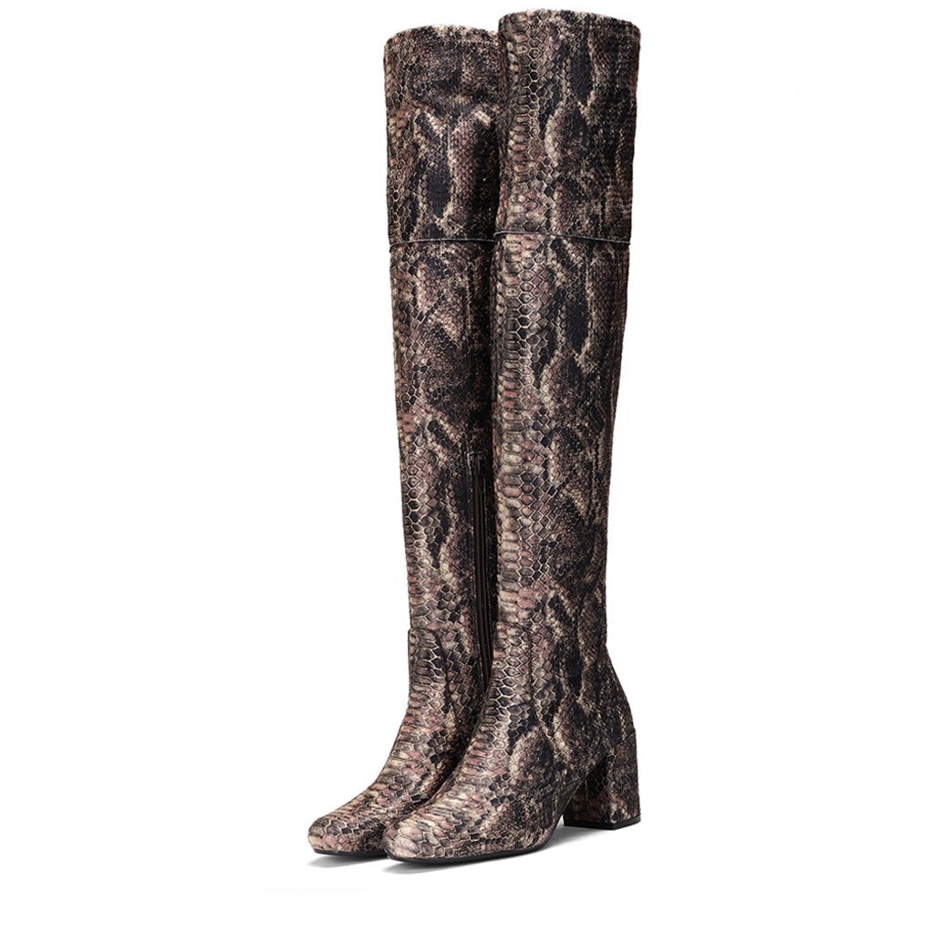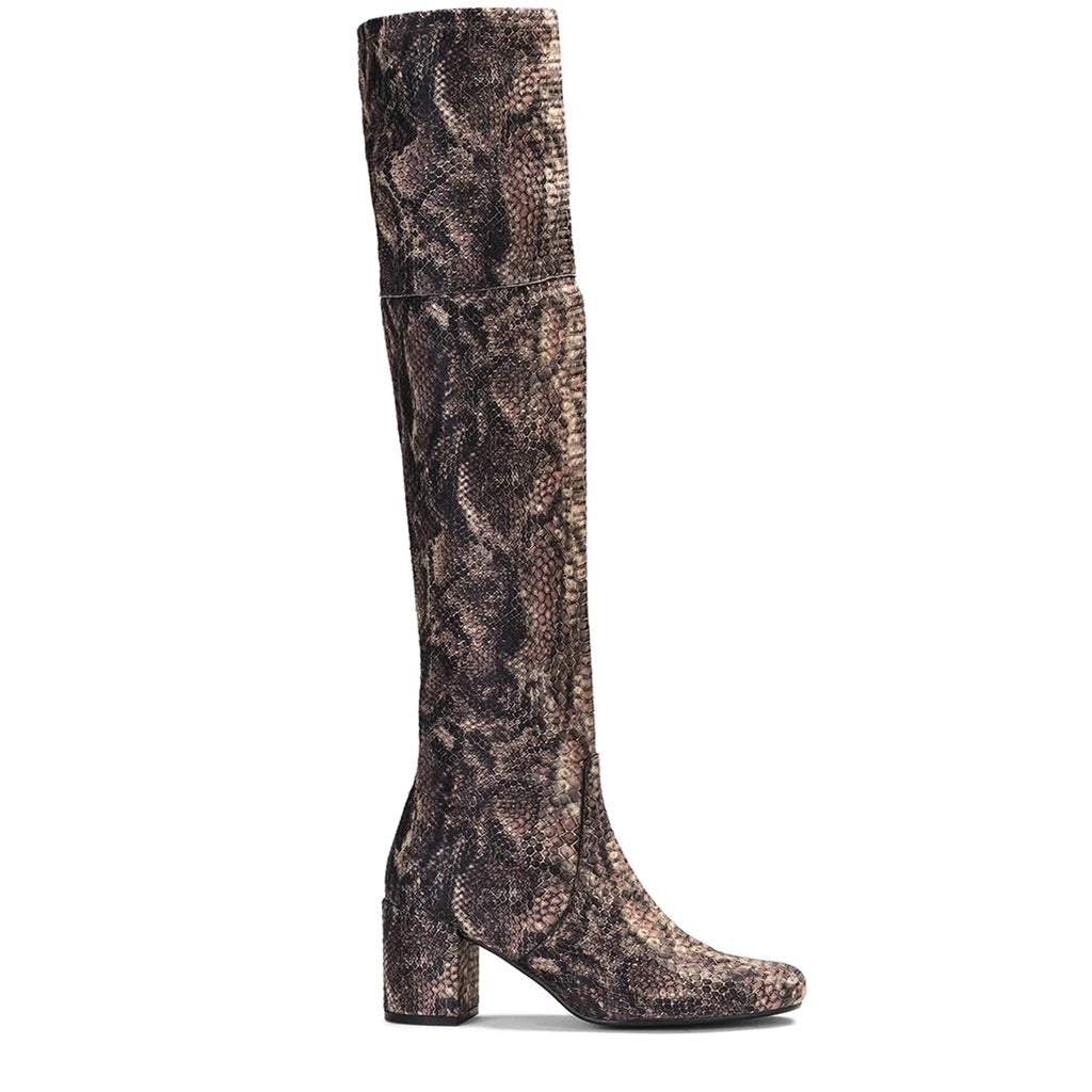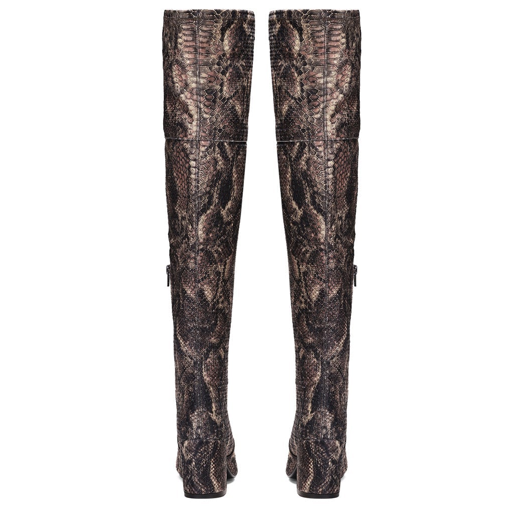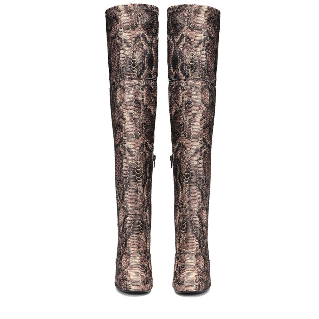 Saint Inez Python Print Brown Stretch Fab Above The Knee Heeled Boots