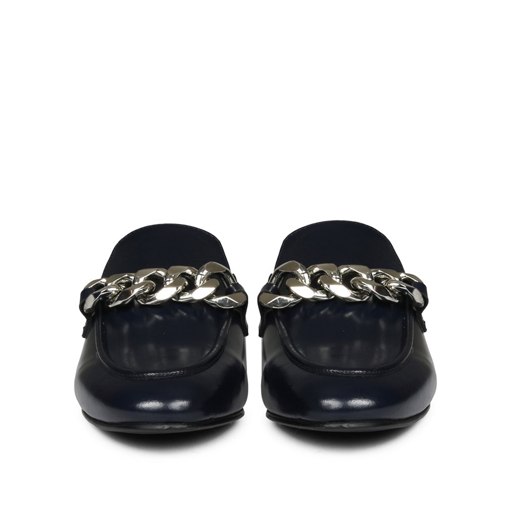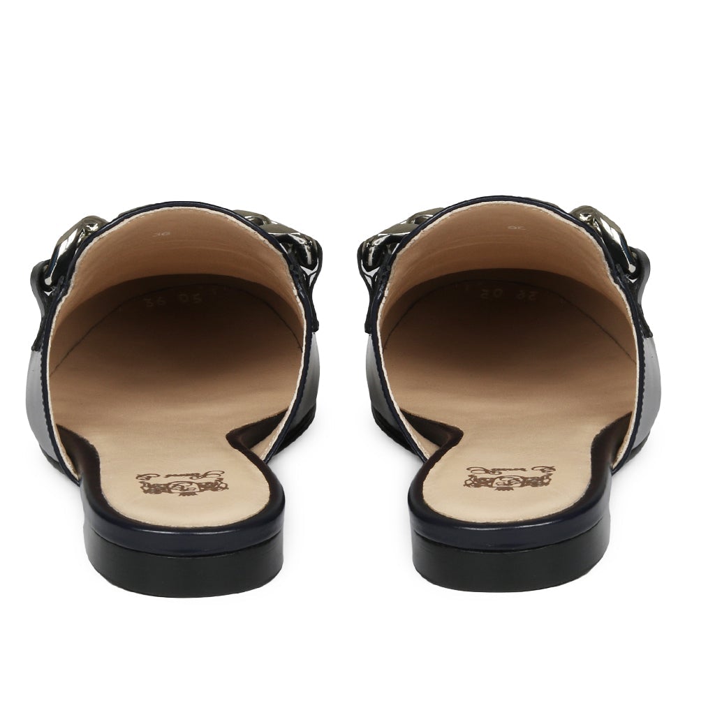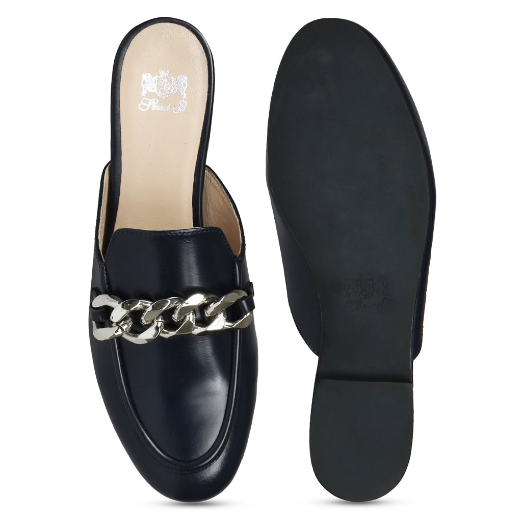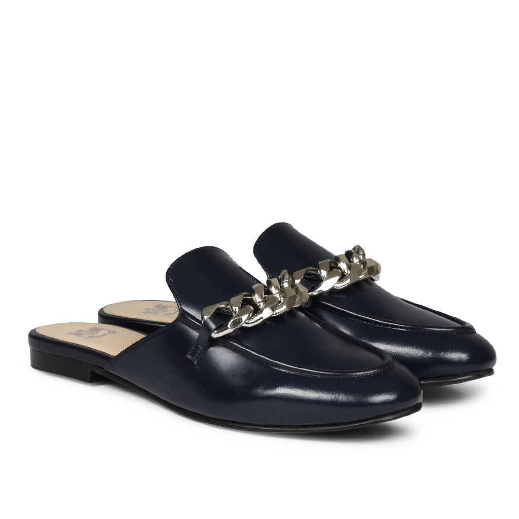 Our navy blue almond-toe mules featuring a gold metal chain at vamp is a modern-day must-have. The leather lining, leather footbed and tunit sole makes these shoes the perfect pair to holiday events and fancy dinners! Each pair is delicately handcrafted with fine materials and perfect to wear all day long.