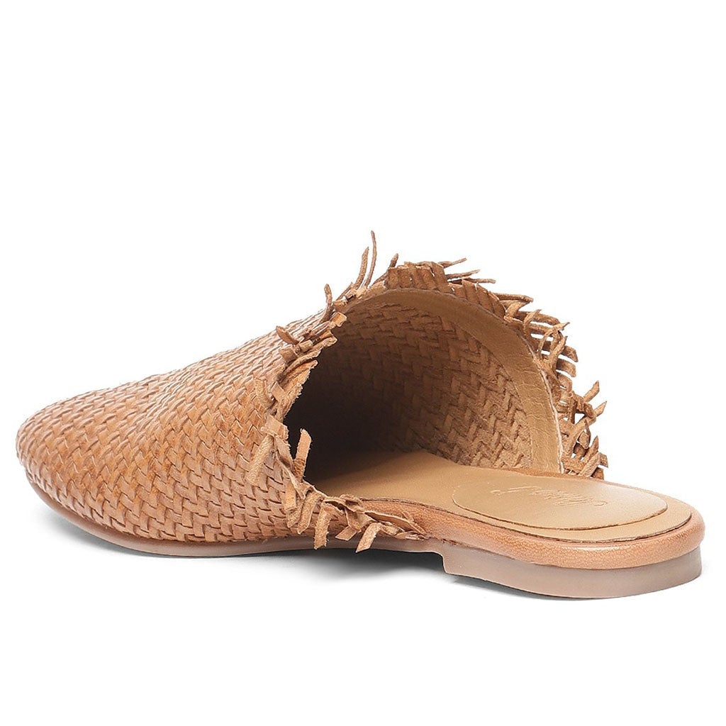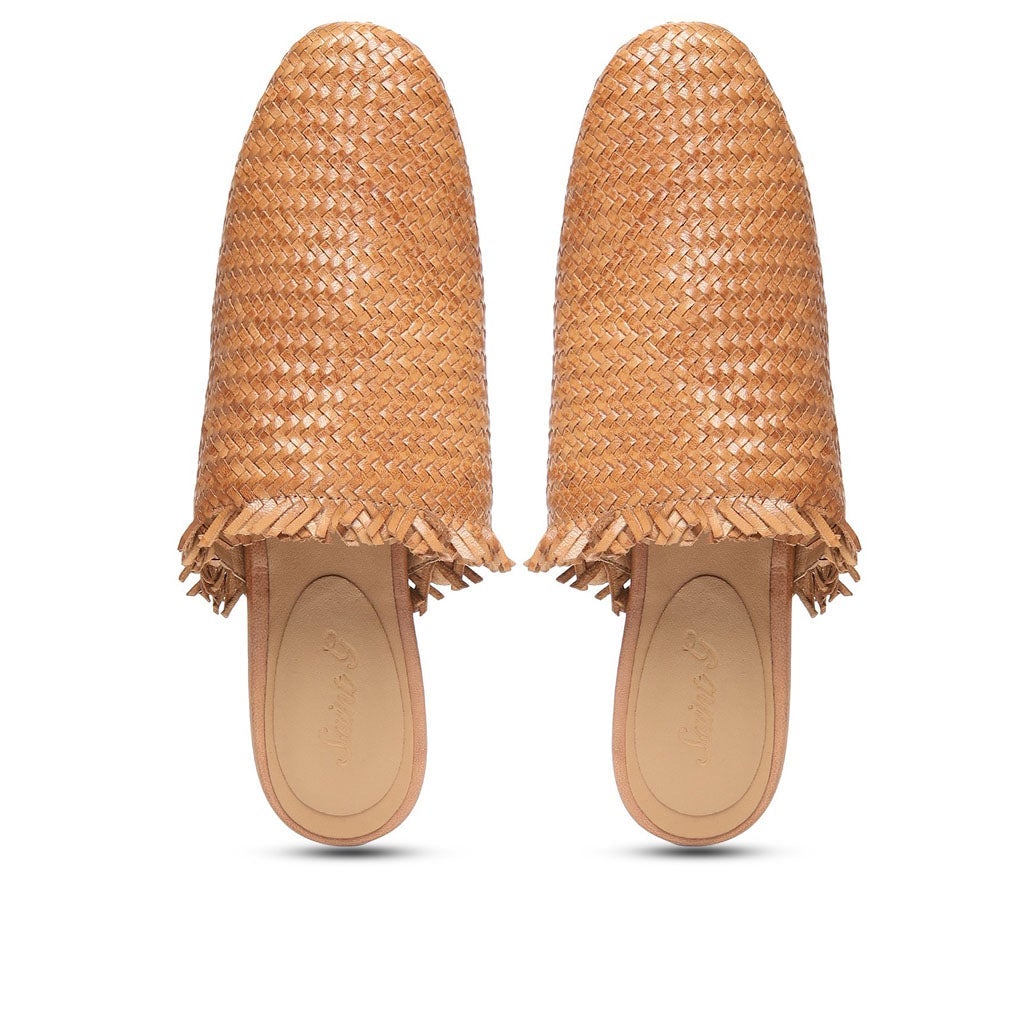 A pair of beige hand woven leather handcrafted fringed flat mules from SaintG. Fashionably luxe and cosmopolitan in spirit, we create exquisite leather shoes and accessories that are quintessentially chic. Each product of ours is the result of fine craftsmanship, attention to detail, and an eye for the beauty and sophistication of leather. With a focus on clean structures and fine detailing, each piece has its distinctive influences and is complemented with an effervescent palette of vibrant colours.