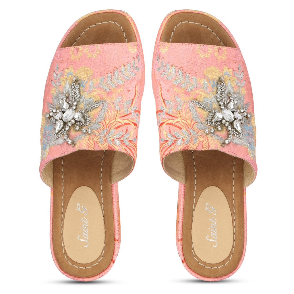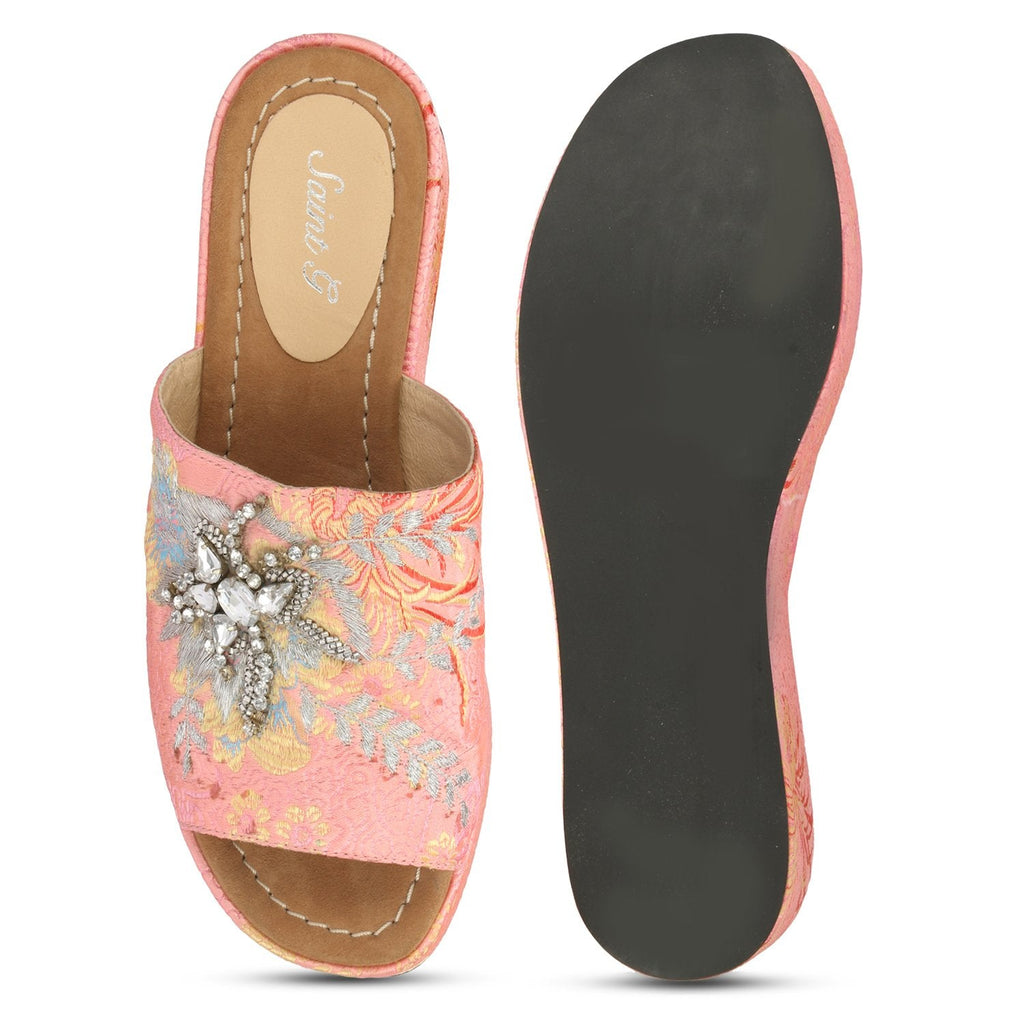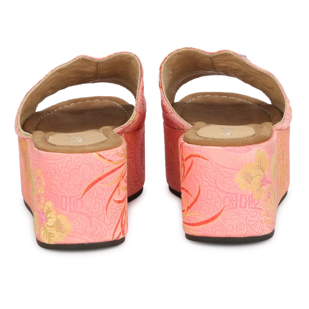 A pair of Pink open toe platform, has regular styling, open back detail textiles upper